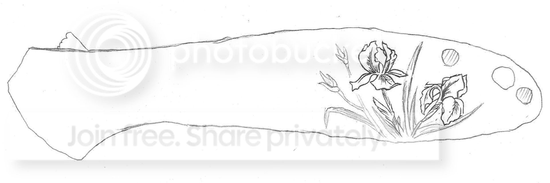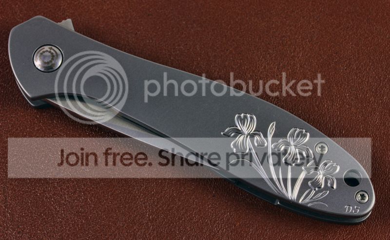David Sheehan did the engraving for me. He was very patient with a first-time engraving client. For once in my life I planned ahead, so I have been holding the knife since March. It has been very hard keeping a secret. I had David engrave irises to match my daughter's name.