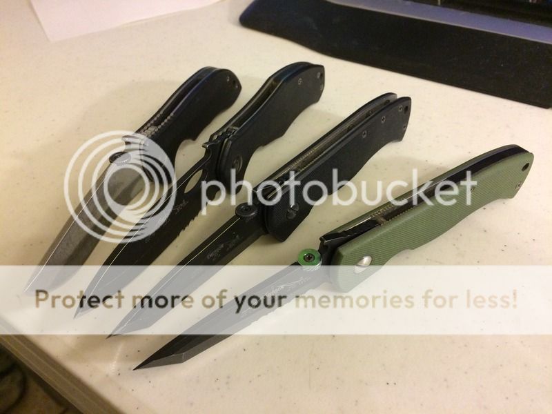 I stated my collection with the CQC-10 (a 2005) back in 2005 when I was deployed in Iraq. I had really wanted a CQC-7, but at that time they were near impossible to find and when I could find one they were going for $250. The years went by and last year I finally added 2 CQC-7's, first was the OD Green handled 2004 and a 2013 a few months later. Then there's the new addition, about a week ago I came across a Mini Commander on ebay at a decent price that I couldn't pass up. It's been through quite a bit of use, and unfortunately the blade logo is almost completely gone. I can barley make out the least bit of year, it's somewhere in the 2000's, either a 2000 or 2009. I really wish Emerson would have etched the marking much deeper in the blade. After I pulled the knife out of the box I noticed it smelled a bit raunchy. I think the previous owner lubed it with cooking oil to keep it food safe, that later went rancid. So I pulled it all apart and gave it a good soap and water scrubbing! I gave the blade some work on a Spyderco Sharpmaker and a bit of stropping. It's good to go now, I just wish the pocket clip was a little lighter, its got a lot of pressure on it and a bit hard to get out of the pocket.