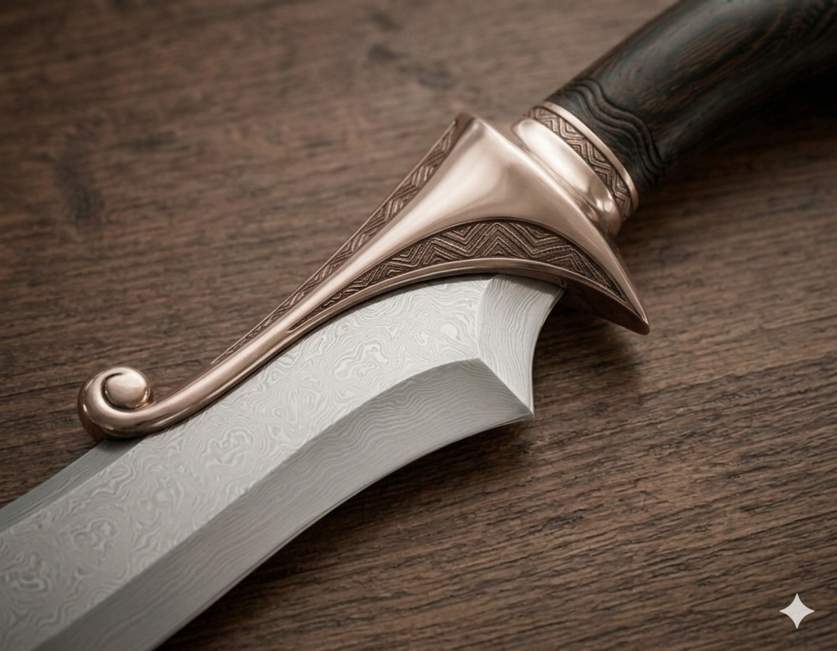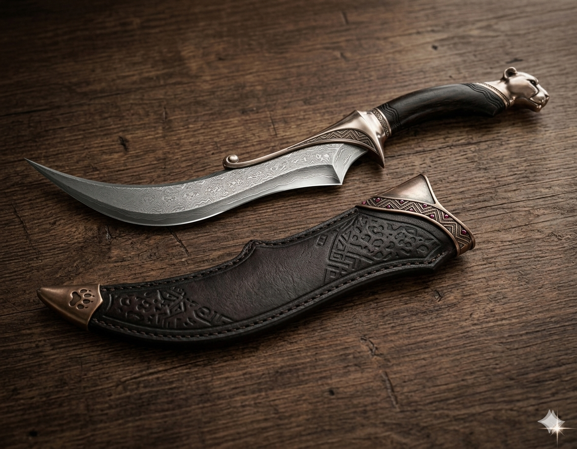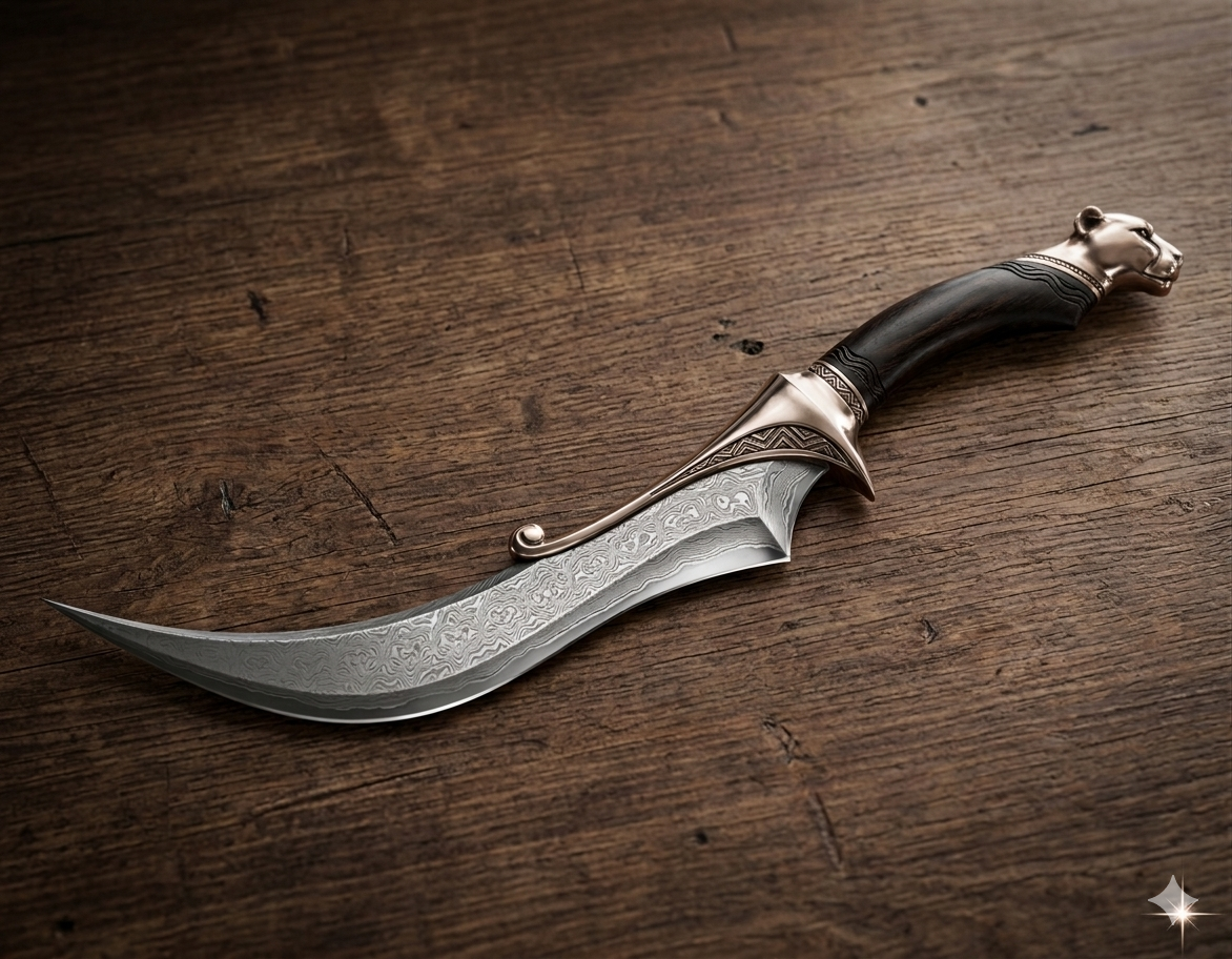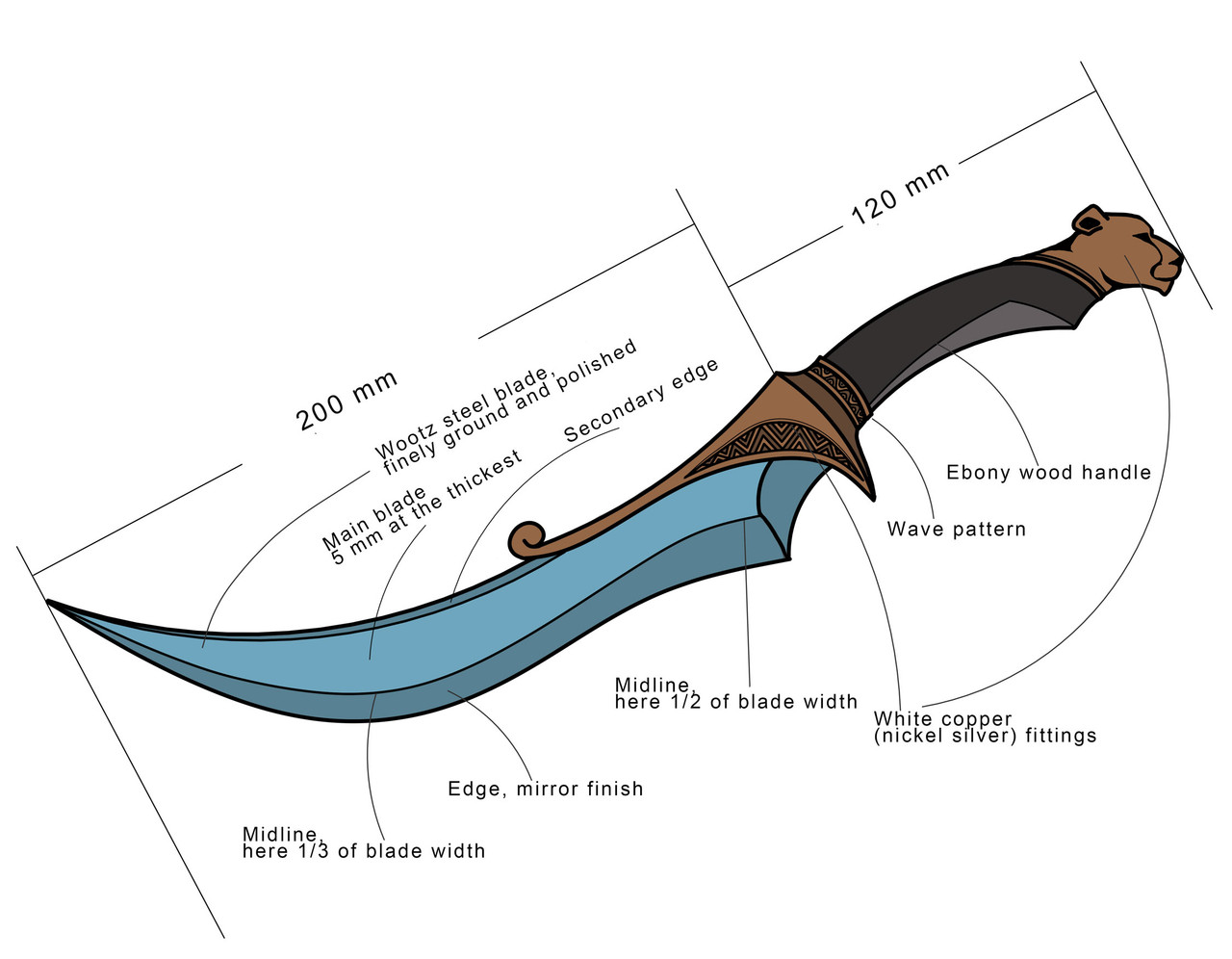 My idea: I want something both exotic and elegant. The curve reminds me something like Indian or Arabic style. The cheetah is my favorite animal which is both wild and elegant. The wootz steel has beautiful texture paired with the wave patterns on the guard. Ebony's black color makes adds some mythical and stability.