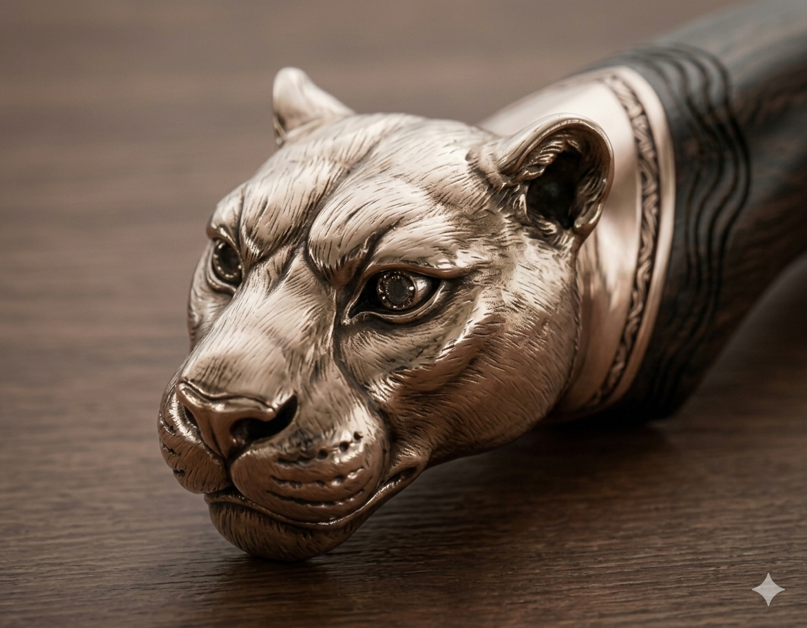 Design 1: Curved hunt knife with Cheetah headed pommel