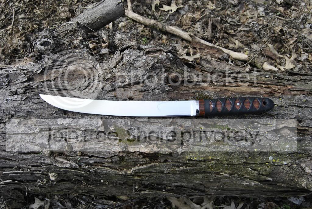 My third blade, 1/4" 12 1/2" long blade distal taper from guard to tip,forged 5160 w/ cocbolo handle wrapped in black leather. I think this one turned out better then expected. While forging, I thought I was never going to get this thing straight. It took a while, but I got it.