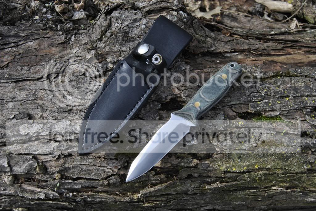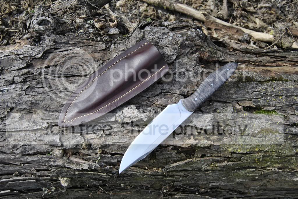 My second knife, 52100 and heat treated trying the triple quench. Its 1/4" thick, and only has a 25 degree edge on it yet will shave hair like a razor. My homemade micarta handle turned out decent, I think. Sheath turned out well too. Notice my pin placement is much better.