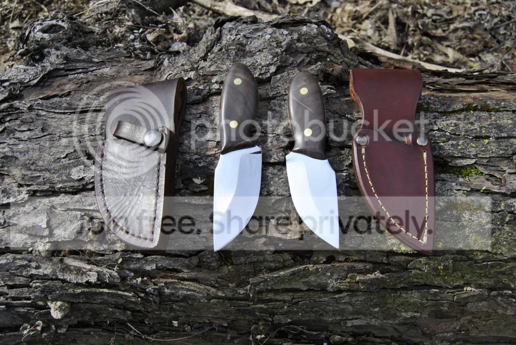 My fourth and fifth blades, AEB-L stainless, 1/8" thick. Handles are black walnut from my backyard. I took down a tree last year and decided to season some of the wood to make a rifle stock. Then I got into knifemaking and decided to make scales with it instead. I'm not sure about my heat treat. I tested them with my files and they won't scratch with the hrc 55 file, and just barely scratch with the hrc 60 file. So I didn't get them quite as hard as I wanted. But they sure did take a nice edge. I tried a couple different sheath styles. One is friction fit, and the other has a strap. First time I used 1/8" stock. Sure is a lot easier to make a blade out of.