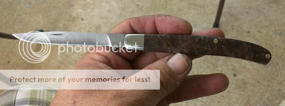 Haven't been very active on the forums, bunch of life got in the way and I've been working on stuff. Thought I'd share my first folder. I guess I've made 400 drawings, 75 patterns and this is what won the "I got made" lottery. 1095 blade and spring, nickle silver liner bolster and pins. Blade is bronze bushed, belt finish with stabilized maple burl scale. There's a few things I need to improve but I'd like the opinions of the guys here. Comments and criticism welcome. Thanks for looking.