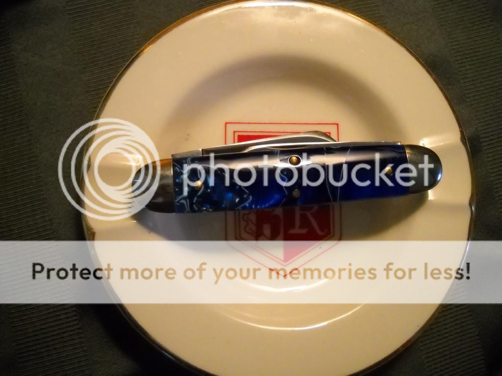 I have had it for about 6 days now, and took pictures when I found the camera yesterday. It was a bit bigger than I expected but I like it. The handles are Blue Oyster acrylic and it is #34 of 50. The pull is definitely a nail mangler, not quite a nail breaker. I love the swedges and grinds, cut hair in an explosive manner right out of the box. I have formed a bit of a patina so far on the clip and sheepsfoot blades, from apples, chicken, steak, and grapes (to form the patina, I don't cut grapes normally). The wrapping for the knife was an amusing surprise, as I had never heard anyone say anything about stickers on the paper in the tube, but I won't say anything that might ruin the surprise.