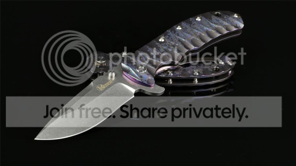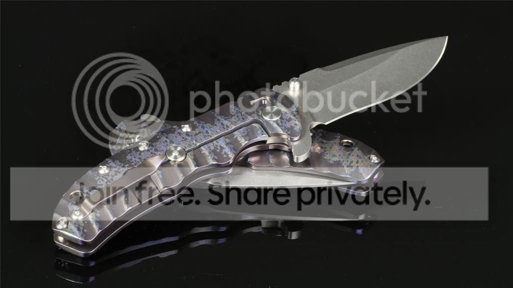First thing out of the box you know you have a heavy knife, and at 8.4 ounces it should be. But this weight does not bother me as I like a heavier knife for the solid feel it imparts. A cursory glance shows that the blade is centered in the closed position, something a lot of folks, me included, like to see. Screw heads are all even with one another, another good mark in my book. Scales are nicely anodized with a light violet/purple color bordering the center area which is sorta speckled with blue and brownish red marks against a grayish background. While very pretty, I would have been just as happy with the natural grey finish of bead blasted titanium.