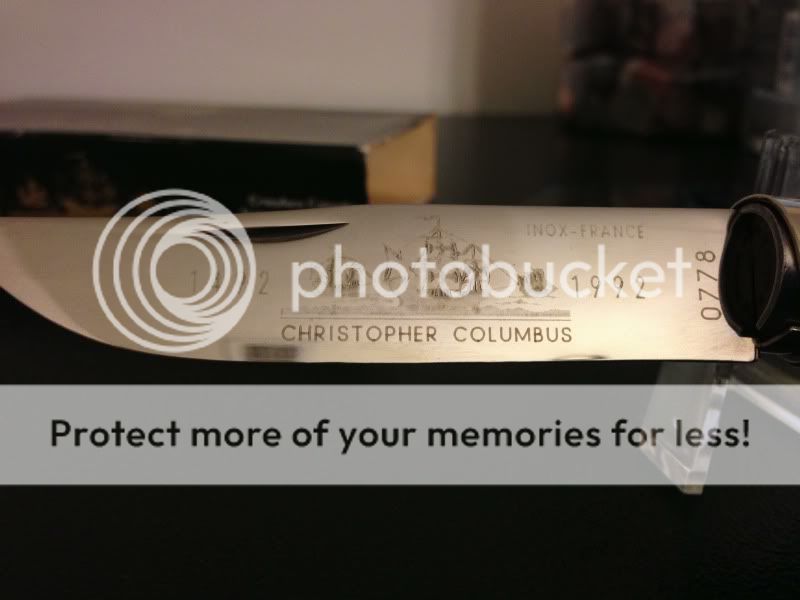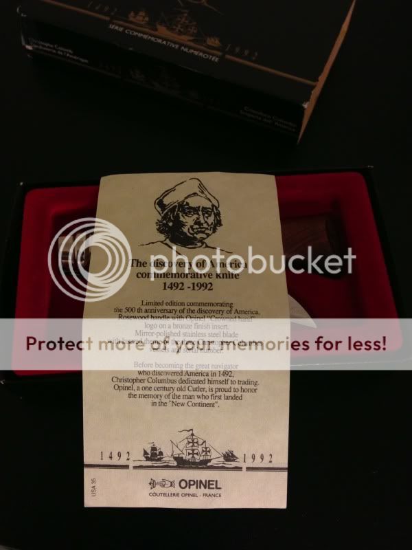 So I was in a favorite gun shop today and seeing his selection of locally made custom knives got the itch going so I started looking for something I could afford and saw an nice looking Opinel sitting all neglected in the back of the case. At $13 I decided "What the heck, I don't have one of those." So I bought it. I didn't notice until he handed me the box that it is, apparently, a special edition. A 500 year commemorative of Christopher Columbus coming to America, so made in 1992. It has a mirror polished blade, a nice etching on the blade, handle is Rosewood and it is numbered. Knife is brand new, box is a little worn on the edges. Is this something collectible?