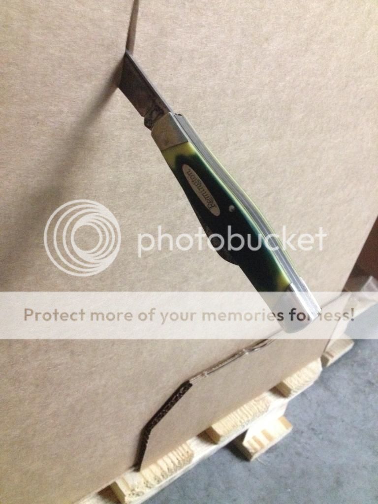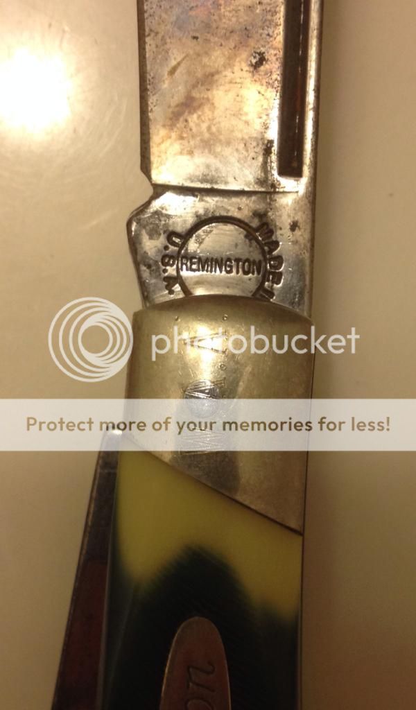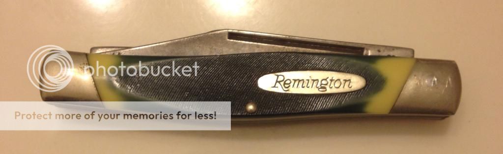 My parents took a trip to Branson, MO when I was around 13-14. It was so my mother could go see Dolly Parton! (At the time, I remember I really wanted to see Dolly Parton too!) Anyhow, when they came back, they gave me this knife. (I was a knife knut even back then! Actually since I was around 5 years old!) they looked all over the place to find one they thought I would like. Green is one of my favorite colors, and at the time I had a Remington 870 to hunt pheasant... So, they got me a Remington knife with green scales. They had the bolster engraved with my initials.