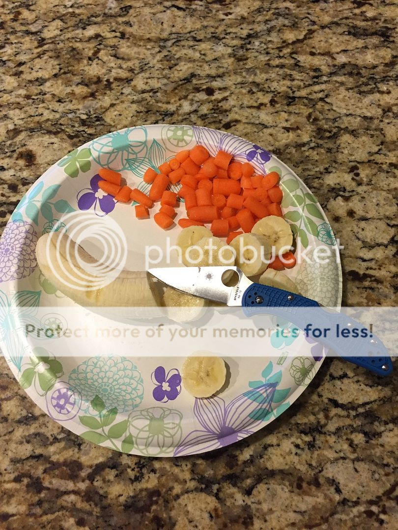 Slicing bananas and carrots as a treat for my Doberman:
