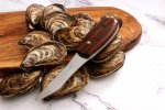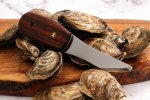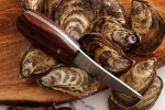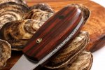 The tip would roll after a lot of use, so I flattened it out and modified the handle, making it much more comfortable to use. Using .094 AEBL treated at 60-61 HRC and a convex edge, this thing pops stubborn oysters like no other! It's hefty. I'm really satisfied so far with it. I lent a prototype to a private chef who told me it was his favorite oyster knife by far. Hope you like the pics!