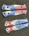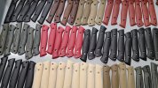 The steel in these knives is S35VN, professionally heat treated to 59/60 RC. I had intended to use primarily Ultrex Suretouch for this production run, but the material wasn't available in sufficient quantities. So, I turned the White River folks loose to use what they had around their factory. Some colors there will just be two knives, while others may have six or more. I was able to secure enough Suretouch that there will be roughly 30 knives available in each color. The sheaths are leather, manufactured by Smith and Son in Sulphur, Louisiana.