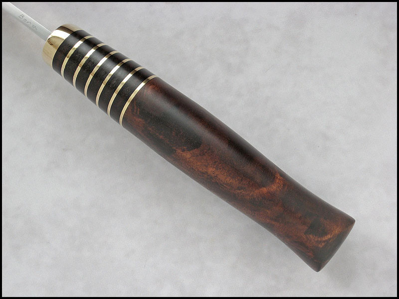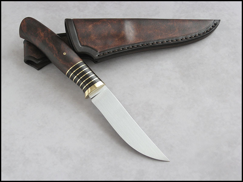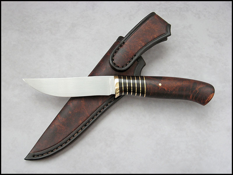Hello. Myśliwek for sale. steel - Elmax / 3.6 mm [0.142"] length - 226 mm [8.898"] blade - 108 mm [4.252"] handle - brass, leather, dyed Maple burl sheath - leather Price - 295 USD SOLD Included International Priority Mail