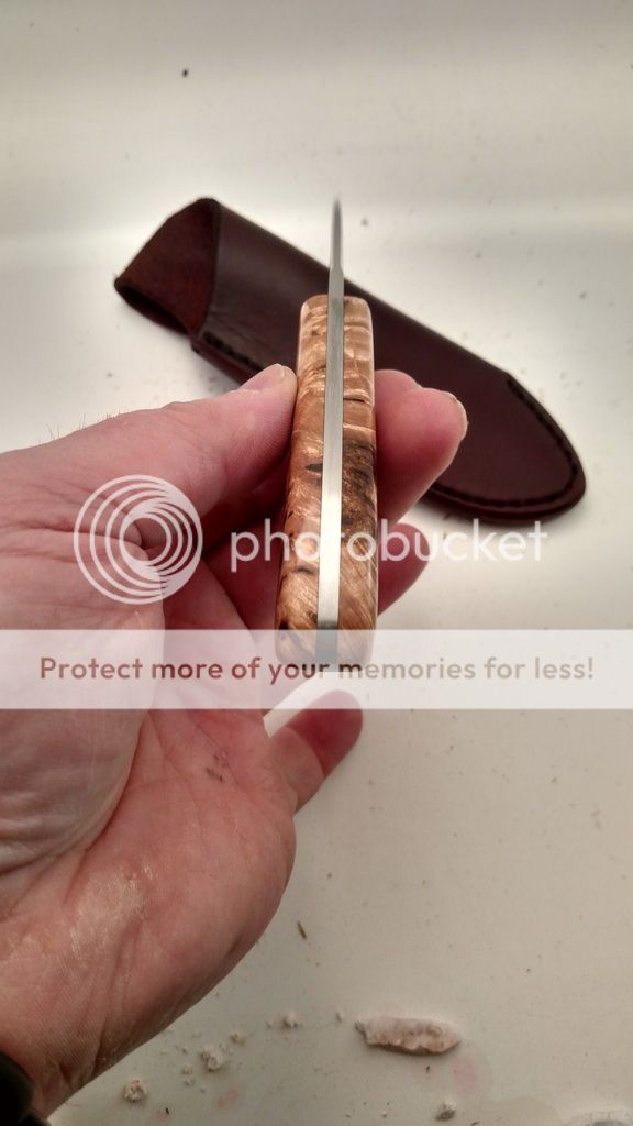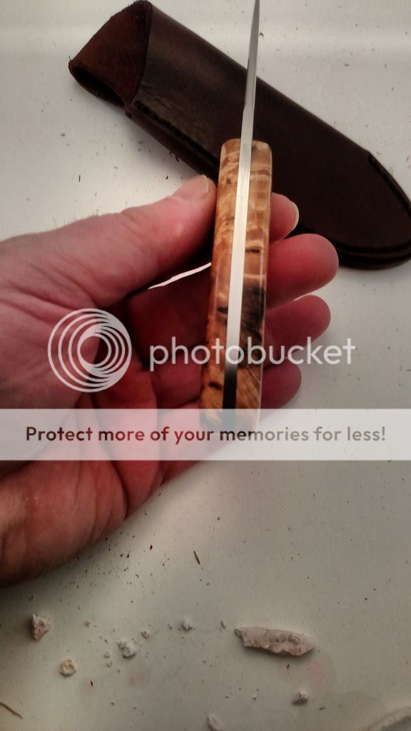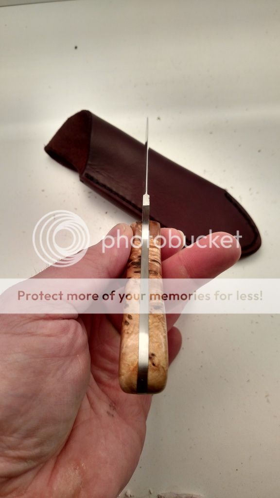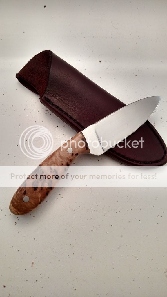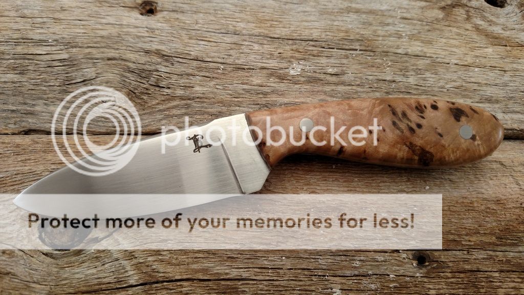 This is one I finished recently for a show. Unfortunately I got the flu the morning of the show so I never made there. This one is Bohler N690 at 61 Rc. The handle is Bark Pocket Maple Burl from northern Wisconsin. The wood was stabilized by K&G. The knife includes a RH leather sheath. Everything on this knife was made by me with the exception of the Corby screws used to hold the handle together. The heat treat, cryo, and sheath is all done in-house by me. Questions and comments are always welcome.