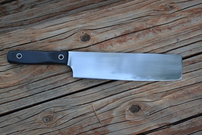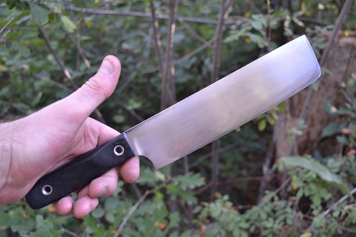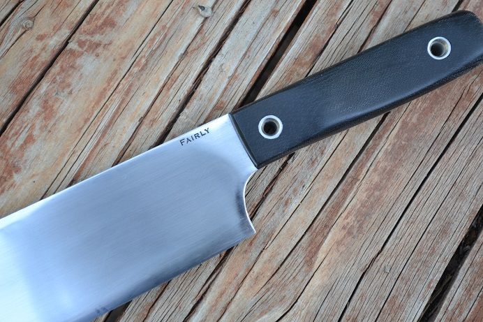 I put a ton of time in on this ambitious project and am very happy with the results. The finish is a user finish, it is somewhat high polished in the right places for food release and a nice feel when slicing. I used flared stainless steel tube ground flush to secure the handles, since I ground the tube it came out a bit funky looking compared to my normal method. Everything has been hand sanded a ton and the knife feels great! The spine and heel are comfortable and well polished. I'd consider this a real working knife that will feel great and work well all day long. I brought the edge to 2000 grit.