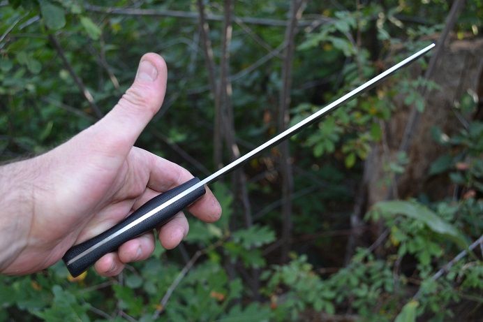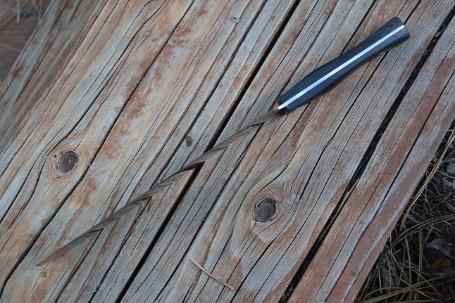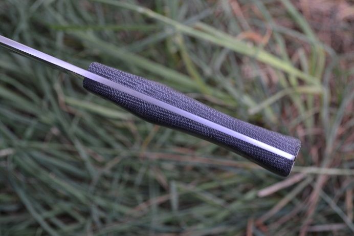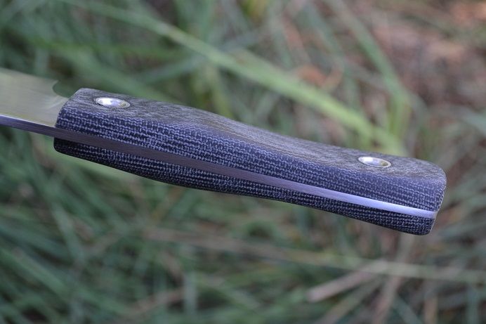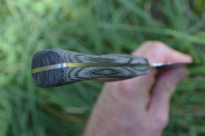 I used some really good looking handle material, I think it is bias cut micarta. It feels great in the hand and looks awesome. The handle material is light and has great grip even when wet. The handle is a Coke Bottle style and feels great in the hand. I received the material from a member here and I have to say I am impressed!