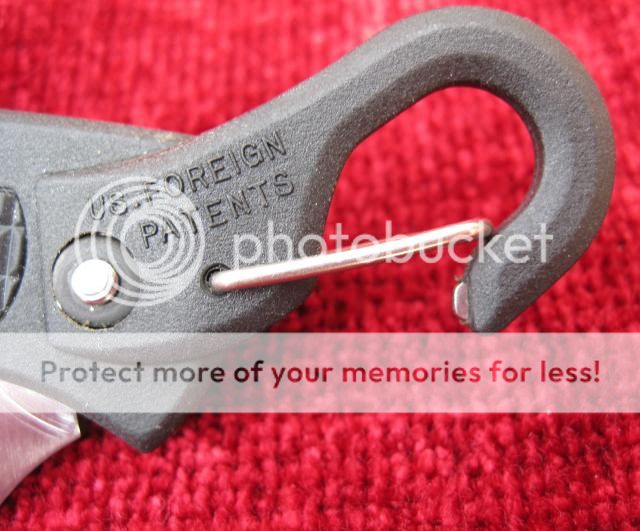 Has a carbiner-like hook that says "US Foreign Patents". Hook is coated with same type FRN? with a steel center that sticks out the tip and metal loop clip.