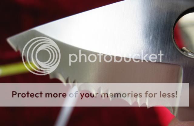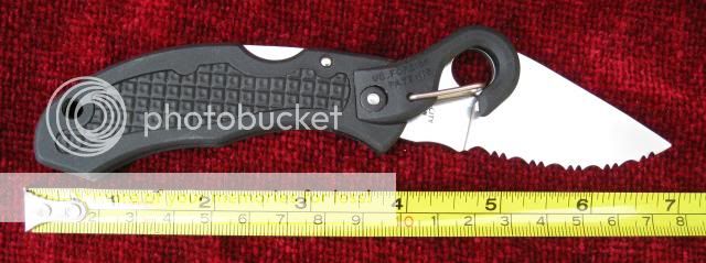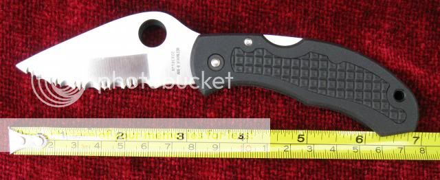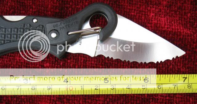 Blade length is 3" overall with 2-1/2" fully serrated cutting surface. Wicked sharp!