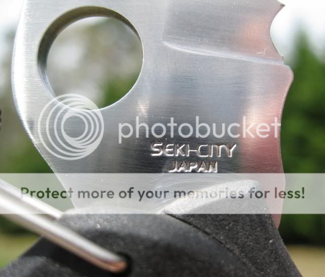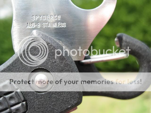 Blade marked "SEKI-CITY JAPAN" on left side near pivot, and "Spyderco AUS-8 Stainless" on left side at pivot.