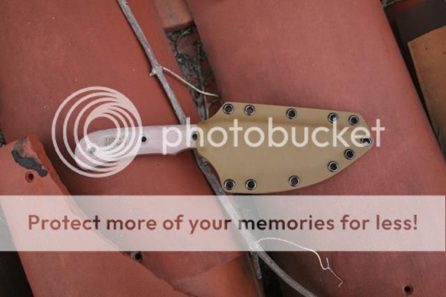 Handle is tan TeroTuf with flared stainless steel tubing rivets, and the sheath is tan Kydex.