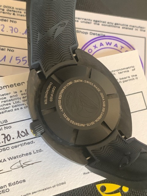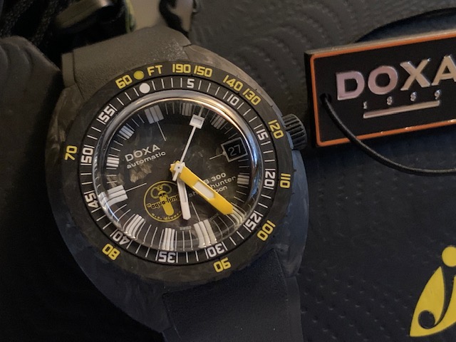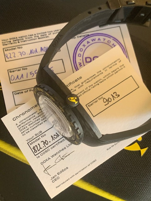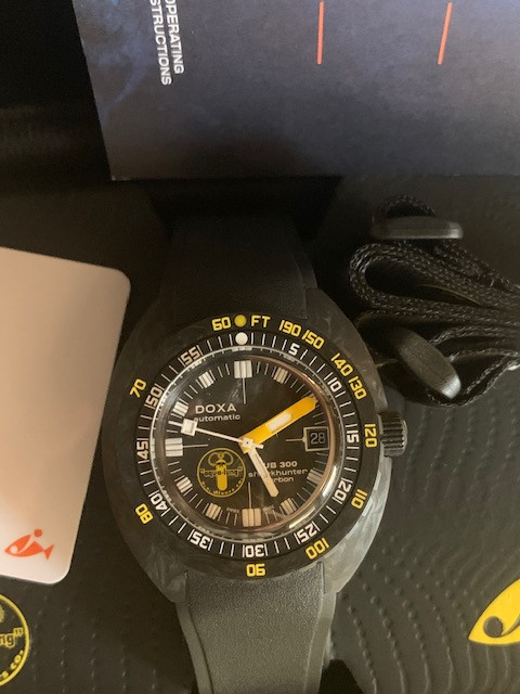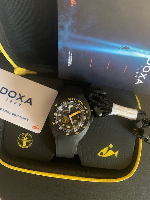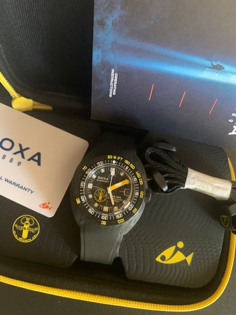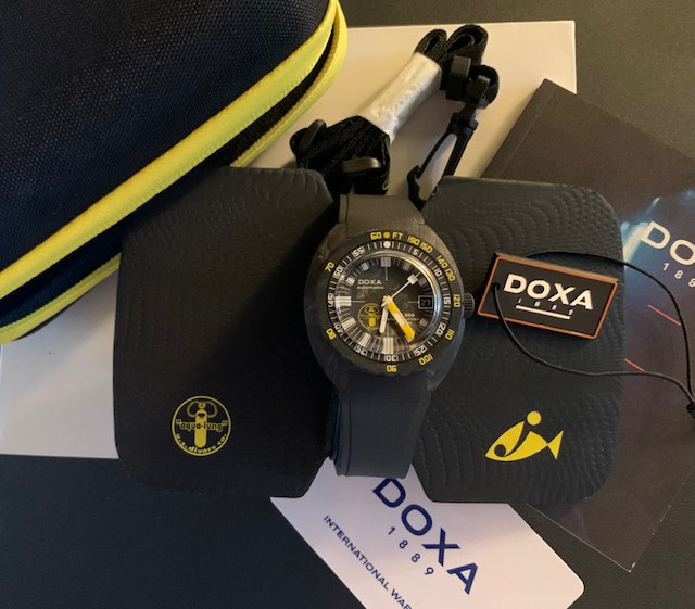 Near mint Doxa Sub300 Aqualung Carbon US Divers Edition (ref. 822.70.101AQL.20) with a complete package (outer box, inside case, lanyard (still in plastic), warranty card, COSC card, manual, and hang tag). This limited edition (300 pieces) timepiece comes with a super light forged carbon case (42.5 mm in diameter). It was originally bought from the DOXA website in in August 2020; it is under warranty till August 2022. The warranty card is signed and stamped but not dated. Here are some quick pictures…