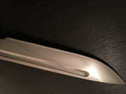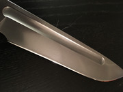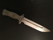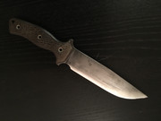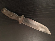Next up is my franken infi ratweiler. This is an infi ratweiler who had a set of gen 1 handles scavenged from an original ratweiler. The tang sits a by proud but in hand it’s not noticeable. The franken ratweiler was stripped, given a convex grind up to the fuller, then bead blasted to give a uniform finish. It was then given an acid bath and hand polished to give it a dark reflective sheen. Finally it was finished off with a mirror polished convex edge. This has not been used since the work was done. I have not seen another infi ratweiler with gen 1 handles. Comes with homemade kydex sheath. There are a few kydex marks.