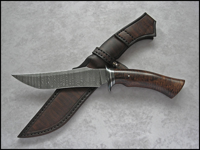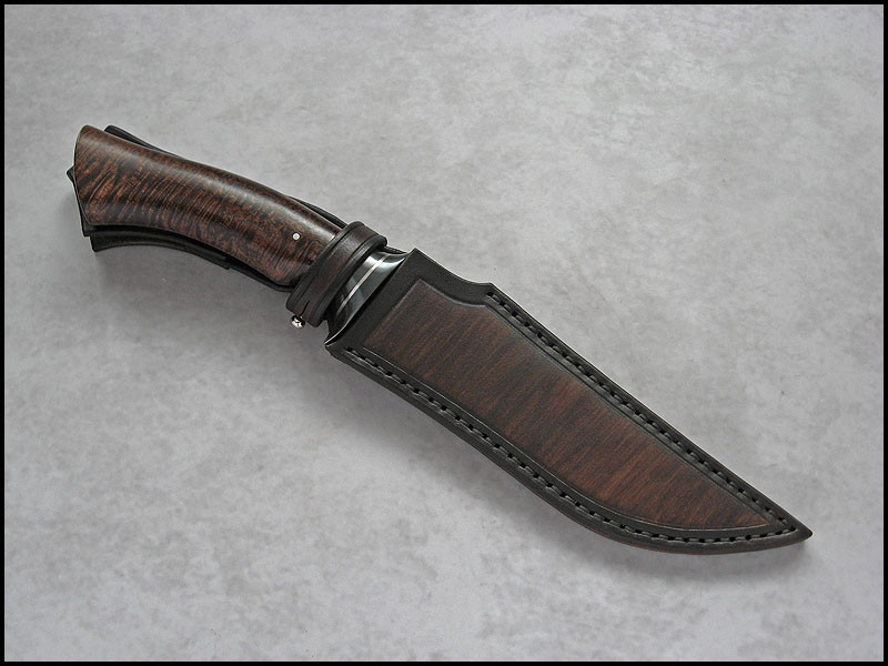 Hi, Friends Nemesis #2 for sale steel carbon damascus / 4.2 mm [0.165"] length 300 mm [11.811"] blade 163 mm [6.417"] handle 1018 carbon steel, stainless steel, stabilized Koa sheath leather Price - 650 USD SOLD Included International Priority Mail