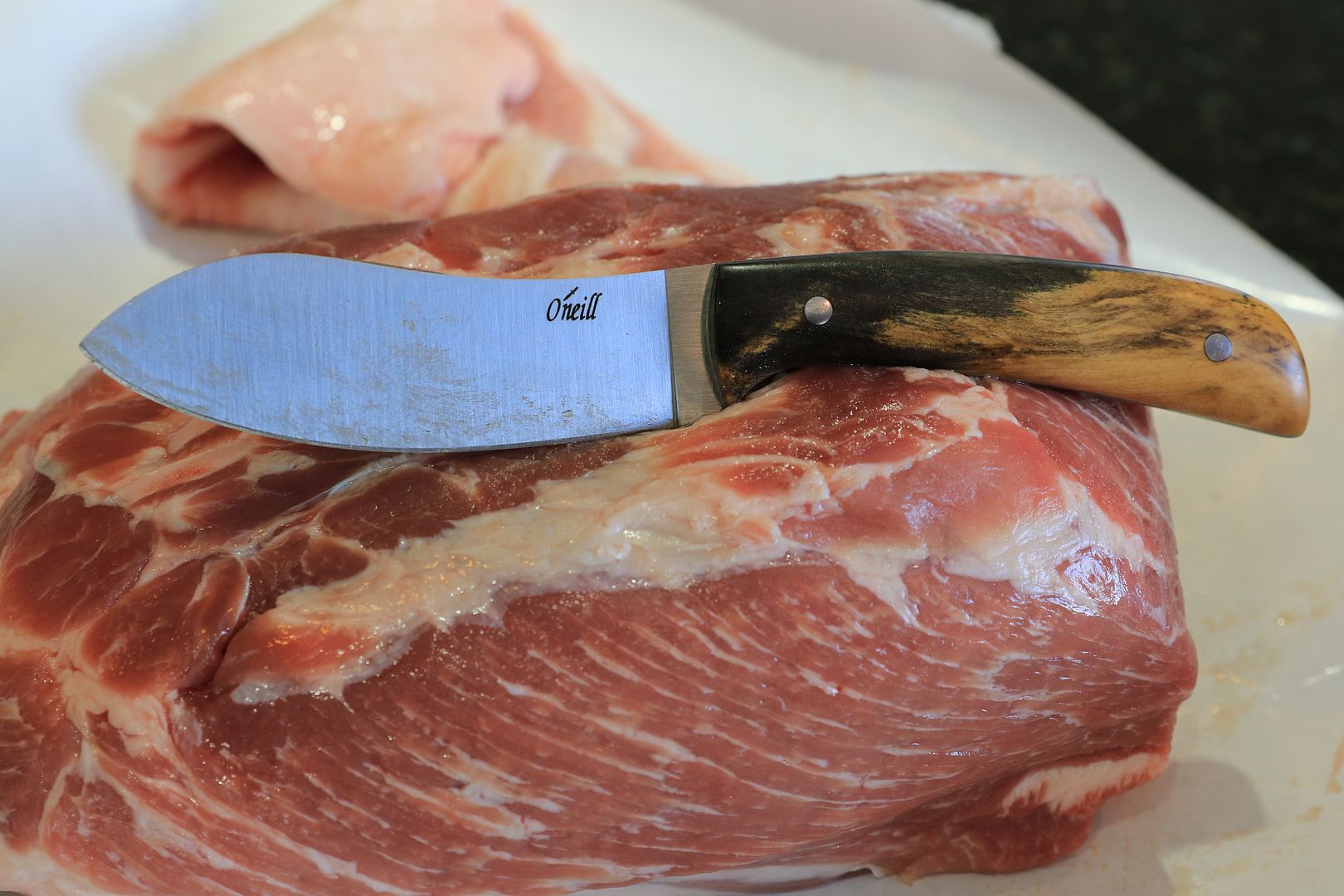 I gave this Nessmuck a full height flat grind from 1/8" A-2 tool steel , it is heat treated to a rockwell 61-62 . Giving that this blade is 1/8" and with a full height flat grind , makes this one awesome skinning blade , slim and sharp .