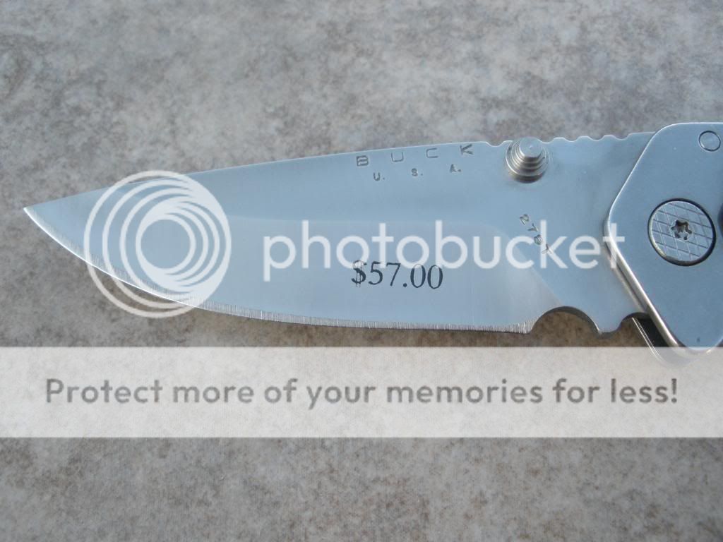 New addition to my Vanguard family. The blade has a price on it that appears to be laser etched on. Has anyone ever seen this and how do you remove it? I think it's an eyesore on an otherwise gorgeous knife. ITE suggests that it is a salesman sample and I shouldn't try to remove it. $39.00 certainly isn't a retail price and fits with being a salesman's sample. I couldn't find this particular knife in any of the special project lists but Chuck and CJ signed the backside in '04.