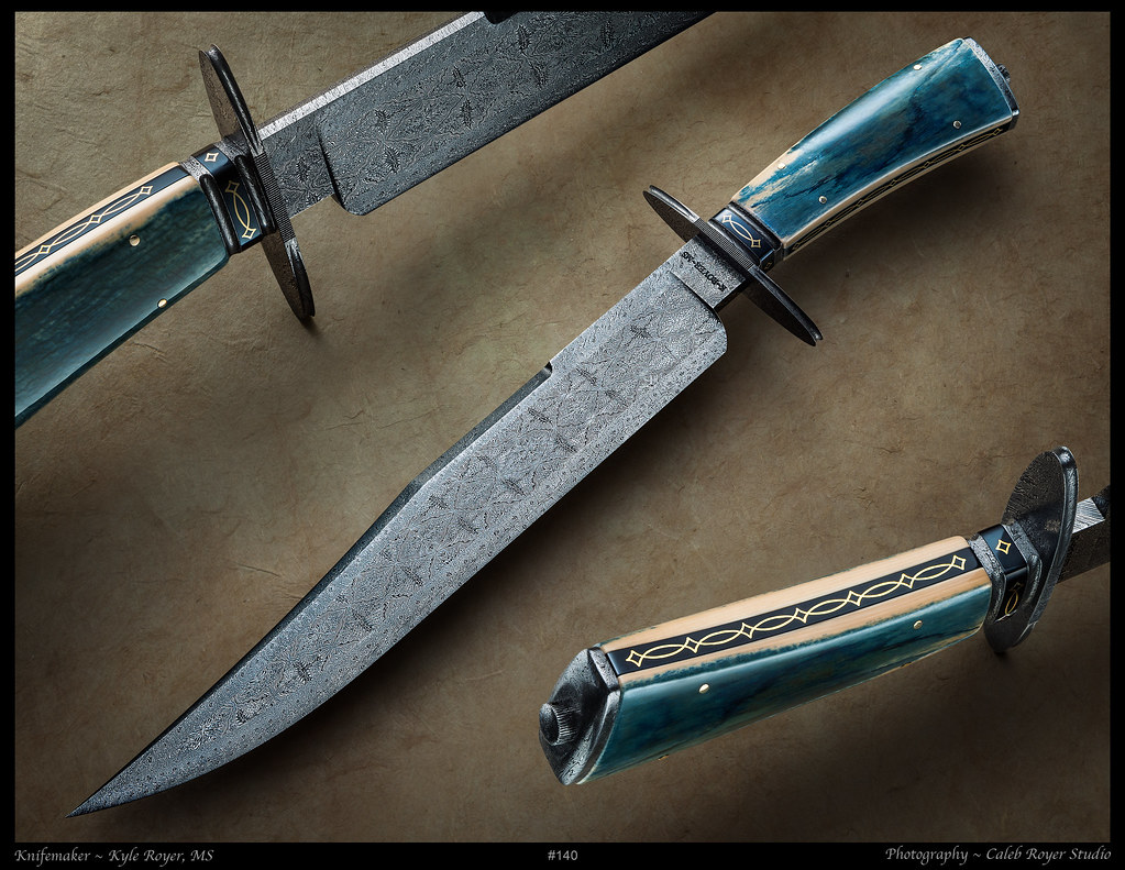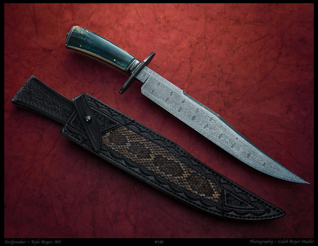 The 11 inch blade is forged from 1080 and 15N20 damascus that has a tile mosaic core with mosaics of the same pattern on the outside perimeter of the blade, only instead of tile mosaic the outside bars are twisted mosaic. The handle is of some really nice blue/green fossil mammoth ivory with four domed gold, 18K pins. All the gold inlay in the blued steel fittings is also 18K. The handle is a take-down for future maintenance and clean up if it ever needs be done. The rest of the fittings are of the same mosaic damascus that the blade was forged from. The guard was grooved and coined, the front spacers were also grooved and the pommel nut was coined. The spine of the blade is crested. Overall length is right around 16 inches. I made the sheath for it as well and it has lots of tooling and a rattlesnake skin overlay. I think thats about it. Let me know what you all think.