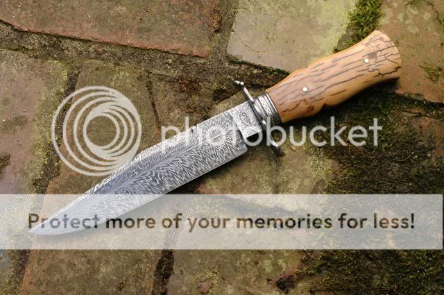 I was very honored to have been asked to donate a piece to the museum, and I'll deliver it in a couple weeks to the Blade Show in Atlanta. The blade is 7 1/2 " of feather-pattern damascus steel. Overall length is 12 1/4". The fittings are sculpted damascus with a file-worked German silver spacer behind the guard. The scales are Wooly Mammoth ivory. It's an art knife and may not appeal to all tastes, but is is comfortable in the hand, balanced, and cuts like a light sabre! My crummy photo so please don't be harsh.