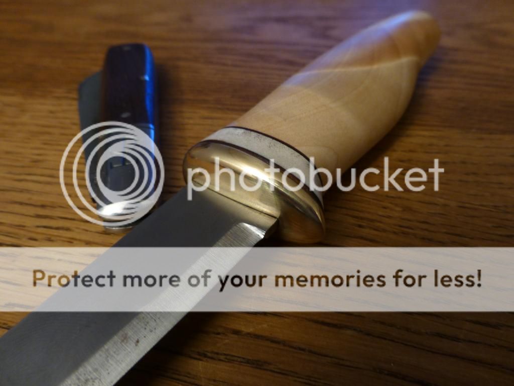 This is my most recent creation, and I thought I'd show it to the traditional folks. The blade is made by a local blade smith. The handle is a birch burl, the bolster is brass and the piece between the two is moose antler. There are thin leather spacers between the parts.
