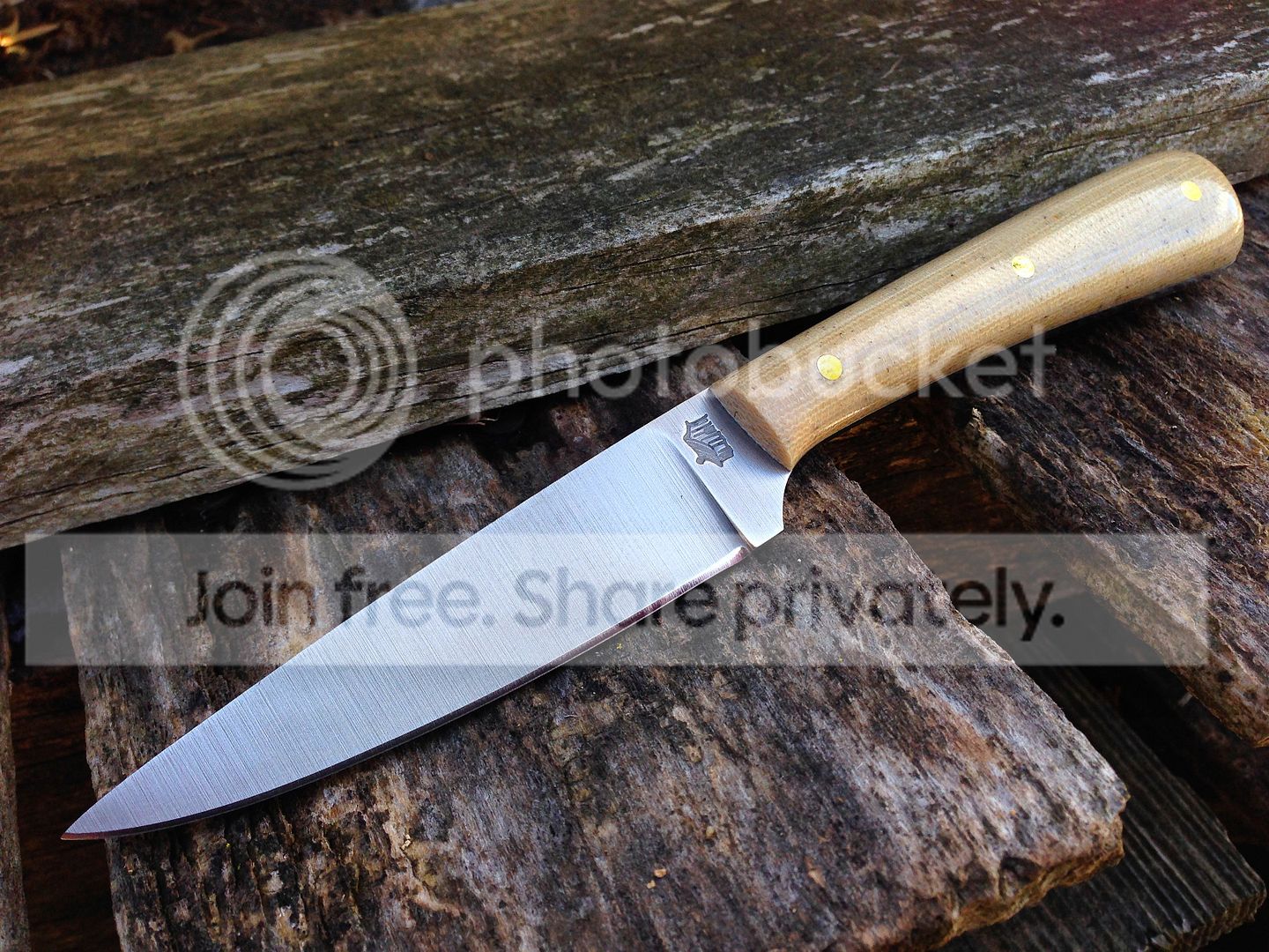 and generally butter knife dull sets, and I got them reworked back to pretty darn sharp by hand. I know it's not 4k-8k+ sharp.. but sharp enough that they were more than happy with them. It gives me things to work/learn on that I can't hurt. I've also done quit a few fillet knives, and some high carbon (pre-1968) run knives that were my grandpa's from when my mom was a kid. Current project is an old Rapala wooden handle knife with a brass piece on the end. I saddle soaped the leather sheath, and milk oiled it. I've hand sharpened it, block sanded handle by hand since the wood on it had 80% of the clear coat peeled off. I've used permanent super fine tip marker to bring out the "Rapala" name on the wood handle. It will get "Golden Oak" stained, Satin cleared before I'm done with it. If you guys want to see, I can post up another thread with some pics?! I've been spying the fiddlebacks; a blue handle one with green underlay is what i'm awaiting to be posted for sale (hint, hint) :dejection: I have to say: many, many of you folks have/make some amazing knives! Thanks for having such an information/picture website!