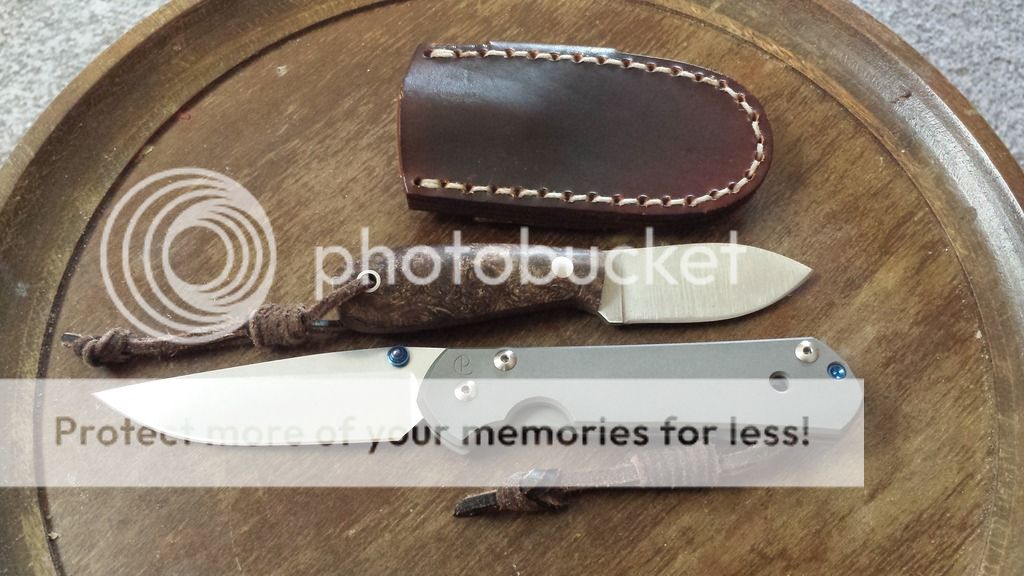 JK Knives, Mini Canadian Belt Knife in O1 and Buckeye Burl and a Plain Jane Large 21 Sebenza with leather lanyard.