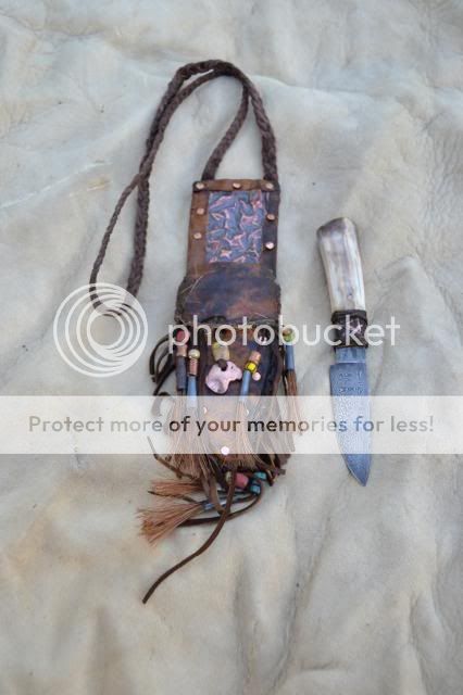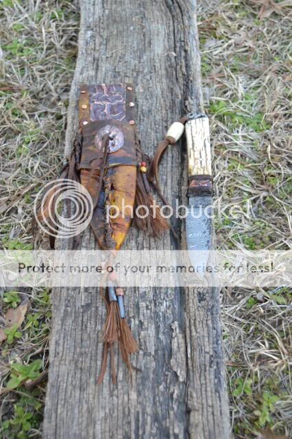First up is this patch/ neck knife in ladder pattern damascus and beautiful bark crackle mammoth ivory.OAL is 7" long including blacksmith's curl, blade length is 3 1/4",This piece has a mild steel handle frame with filework, patterned copper band with rawhide wraps and a dangler with deerskin and mammoth ivory bead.The sheath is a center seam style and is heavily decorated and can be worn on the belt or around the neck via a removable lanyard.