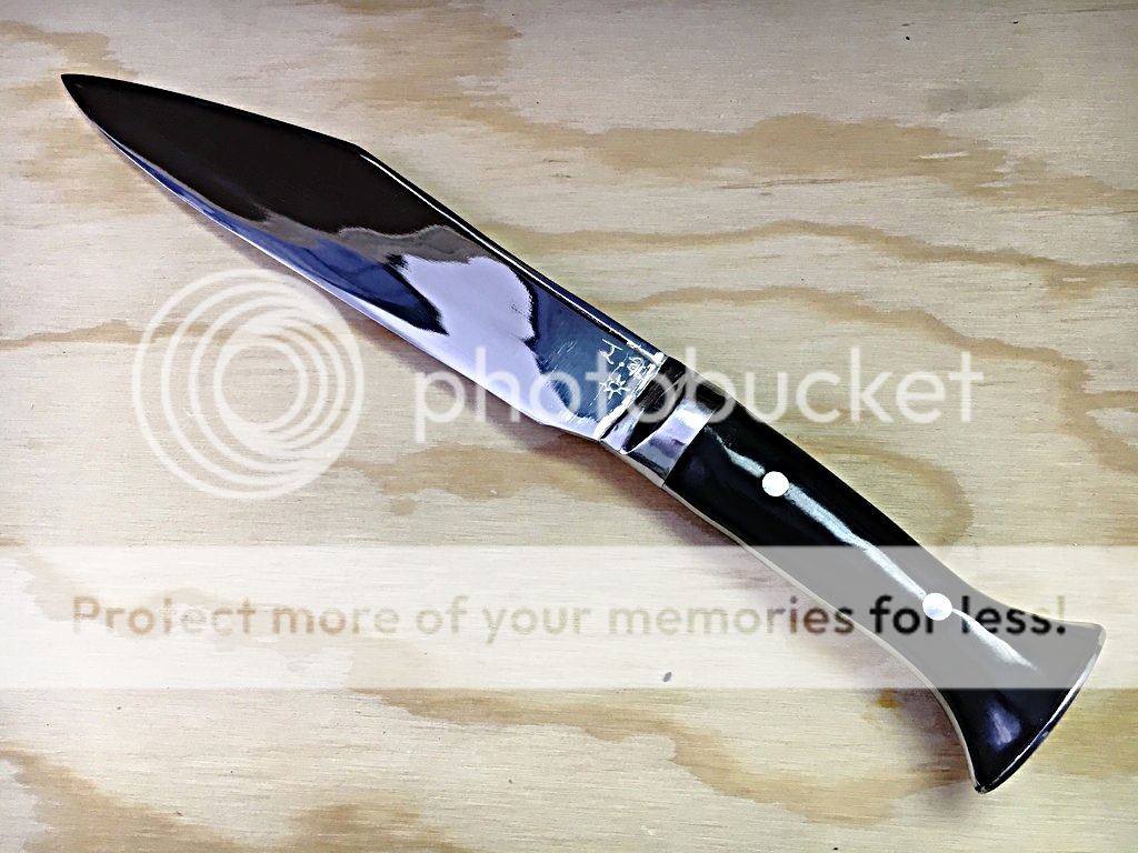 So like a child on Christmas at dawn I tore into the coveted triangle box not sure what to expect when I got to the middle. Inside was a 14 inch 17 ounce Seax by Lachu but what the heck did that mean right?? Well once I opened up that bad boy I couldn't help but whimper a bit... Technically a short broken back Seax with a Nepalese twist, I think, this is quite an impressive blade in the hand. For such a substantial blade I have to give props where props are due! The balance on the 9 inches of blade is perfect at just above the handle & it makes it quite light & nimble in the hand, for what at all appearances really should not. 14" blade or no my opinion is that this blade has the soul of a throwing knife. Well done Lachu!!