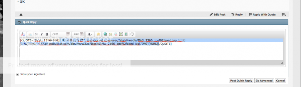 I sometimes wish that a few of the members would at least put a little more thought into their replies and think about dropping the pictures from a multi photo post or just picking one of their favorite pictures from that post and carry it forward. If a person