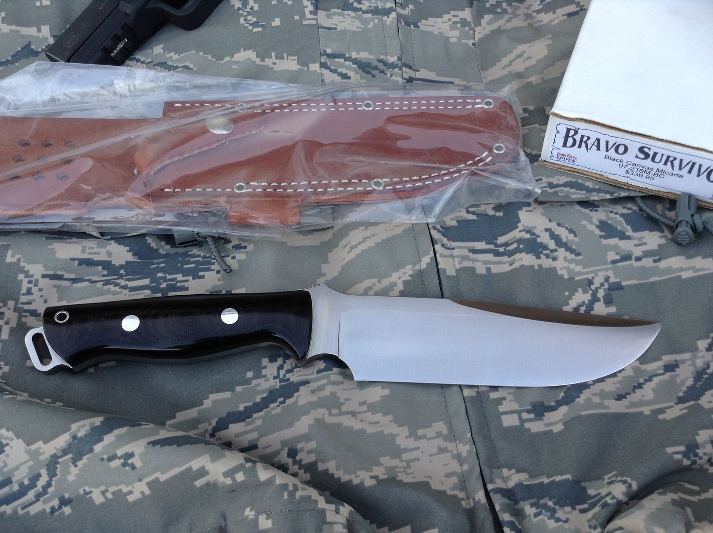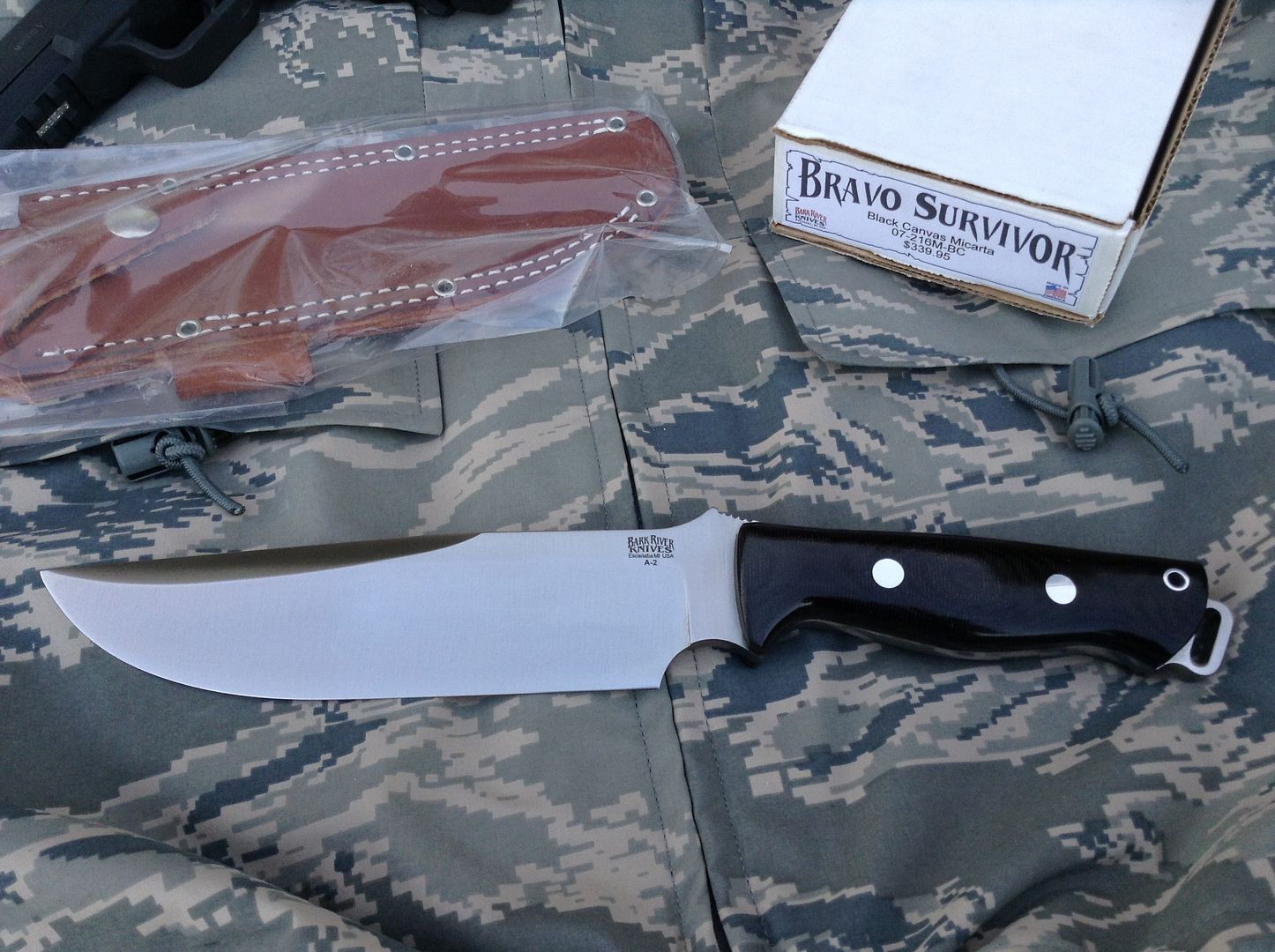 Here I have a new, unused Bark River Bravo Survivor in A2 tool steel with black canvas micarta handles. This is new, unused. The leather sheath has never even been out of the plastic. This is one big, bad knife. These are $255 at DLT and have been sold out for a while. Get this one for ---Sold--- net to me. Payment via PayPal (yours choice of "Friends" or add 4%) or a postal money order if need be. Please contact me with any questions.