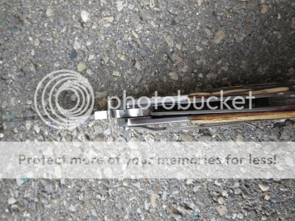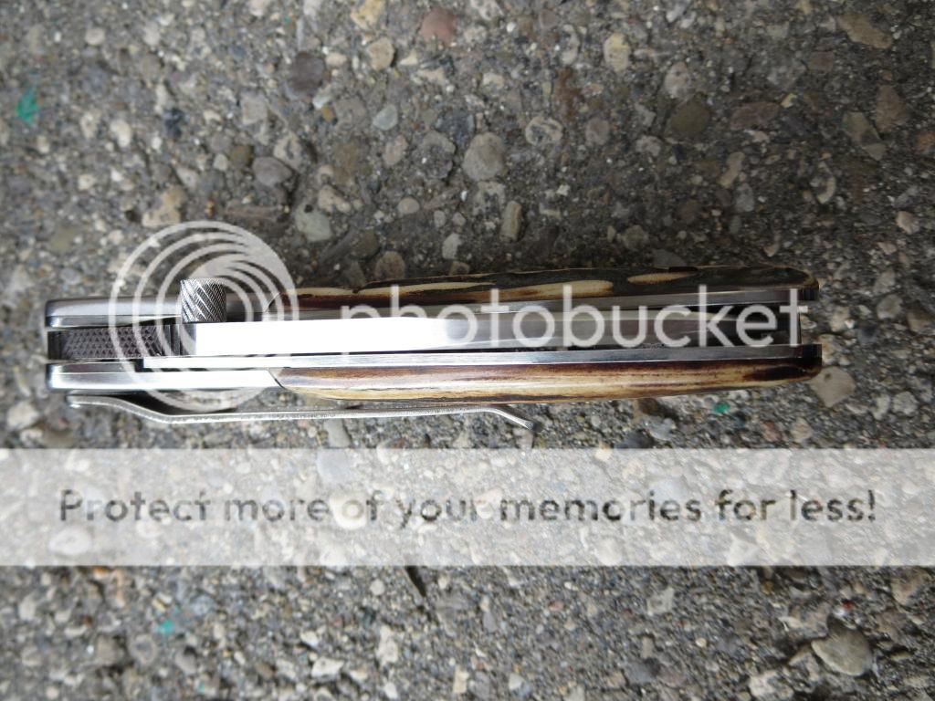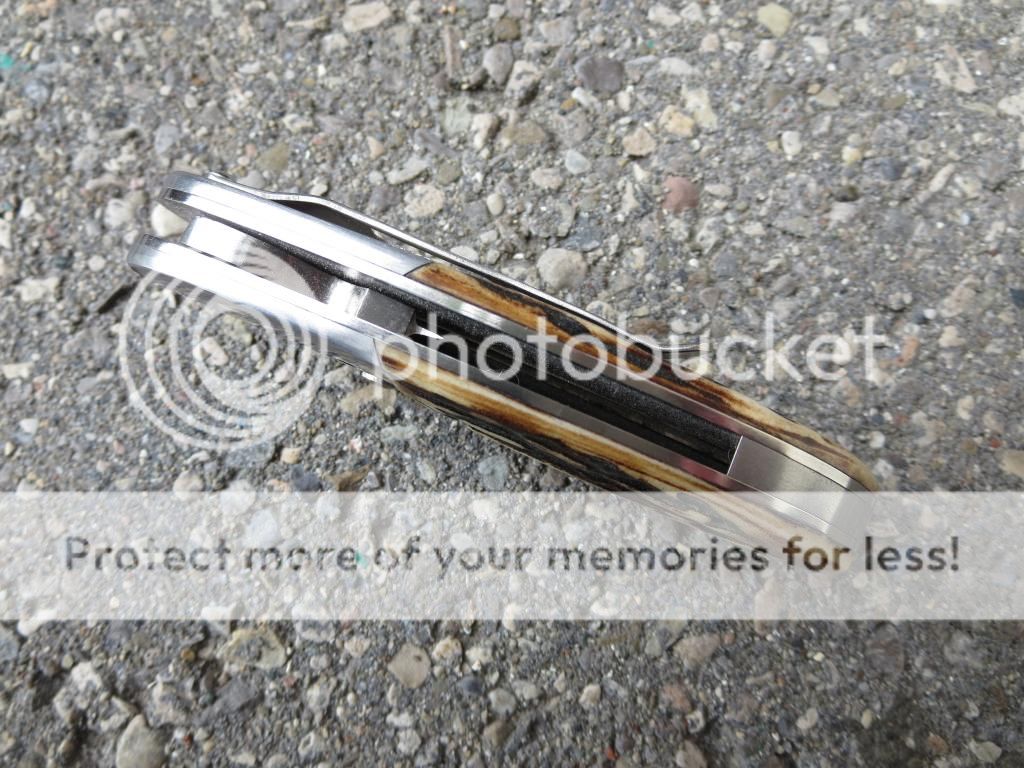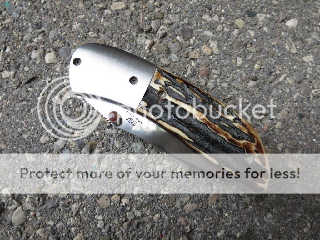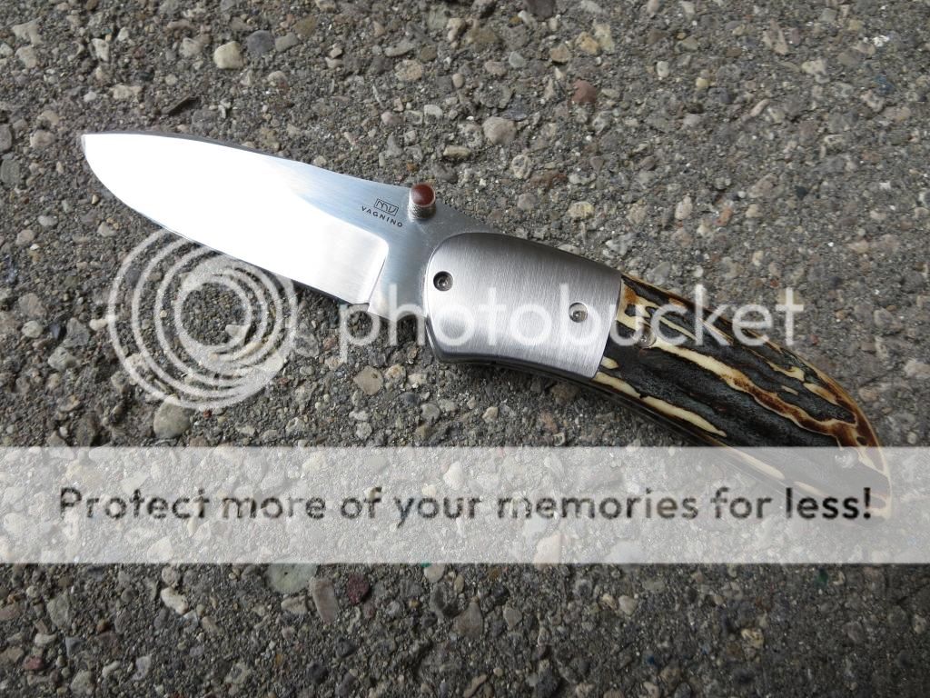 Michael Vagnino amber stag P38 manual. 2 3/4 CPM154 blade, 3 3/4 closed. Stainless bolsters, liners, clip and backspacer.