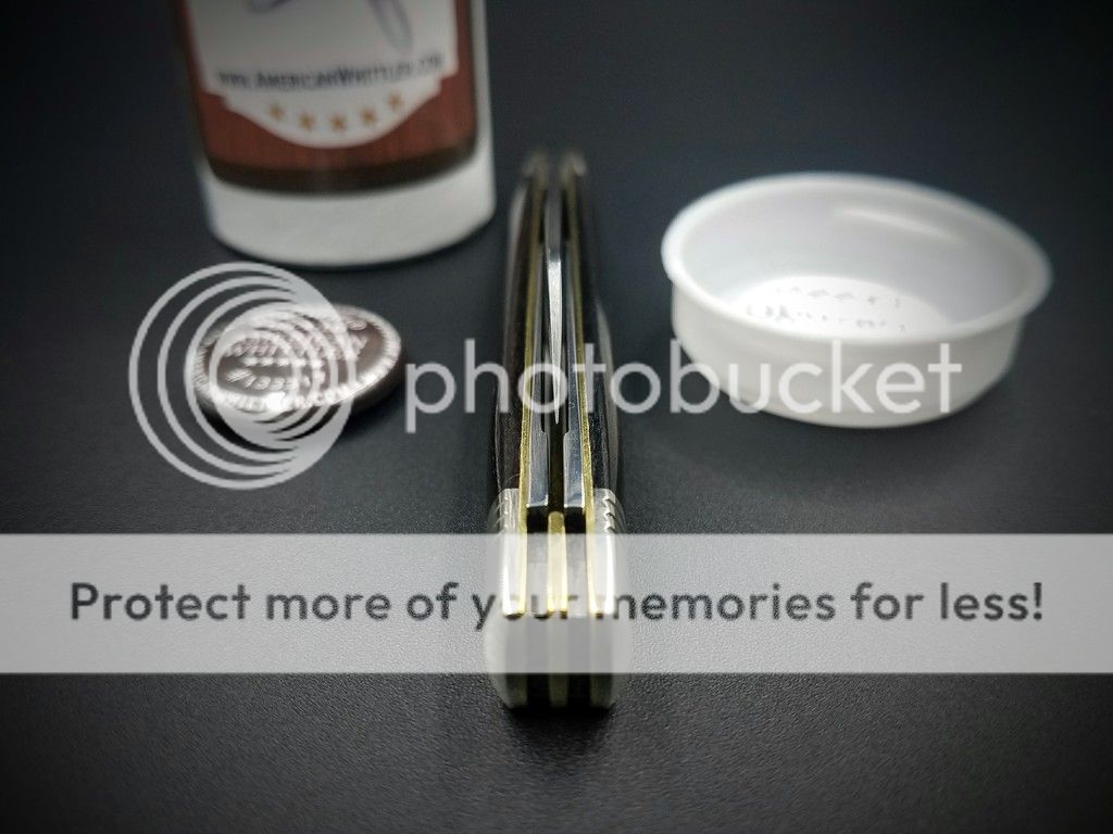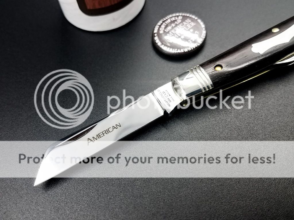 Knife comes with tube and button as shown. Knife is typical F&F from factory with very few stray marks, as usual with GEC. Well centered main blade with "American" etch; secondaries do not rub. Well executed.