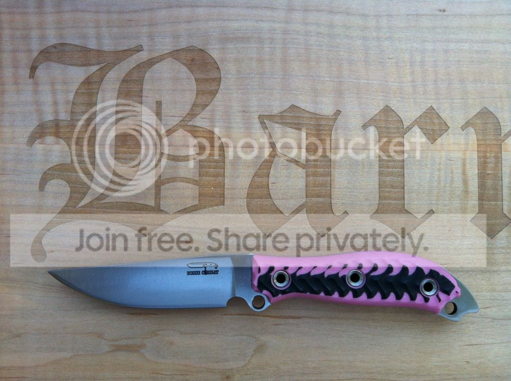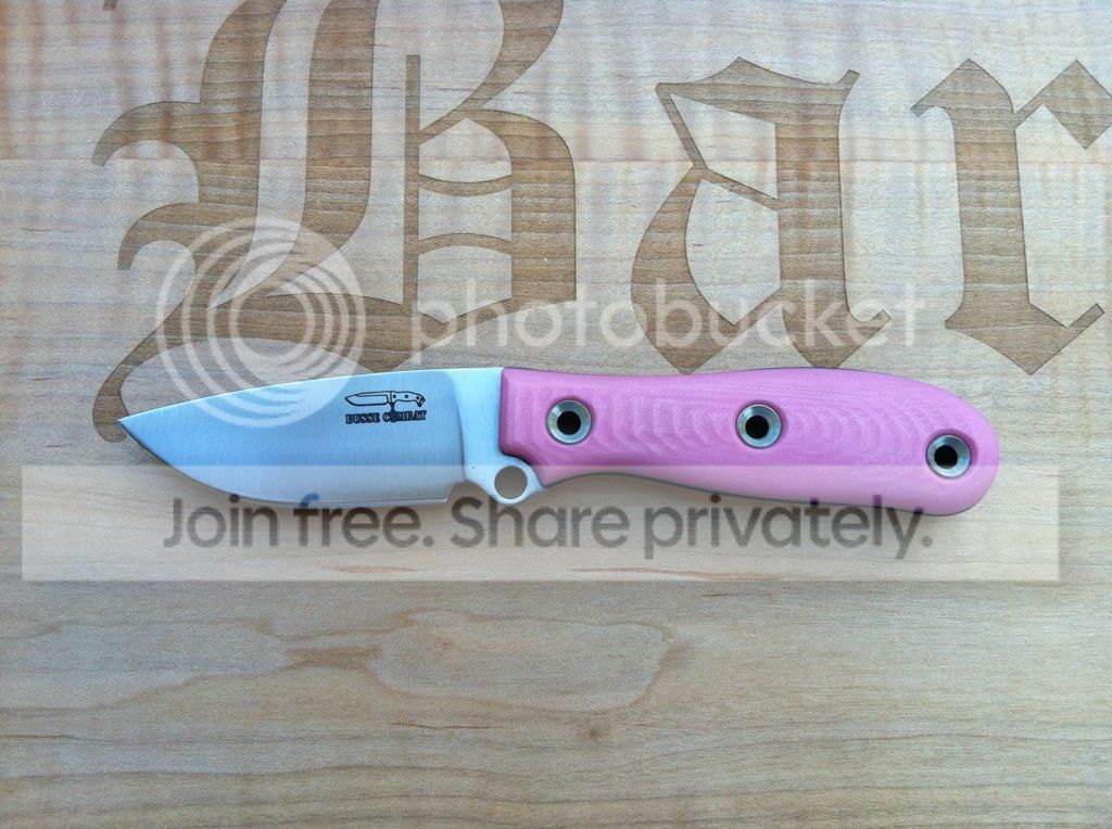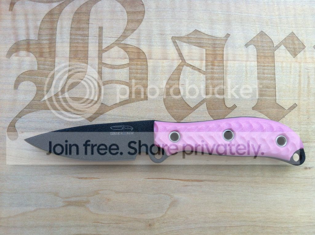Game Warden with pink and black G10 scales - the black is on the inside, against the blade on this one, satin blade. My calipers read 0.140" in front of the scales.