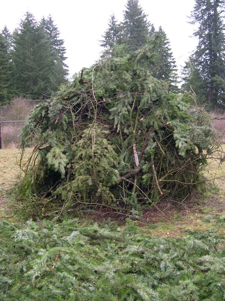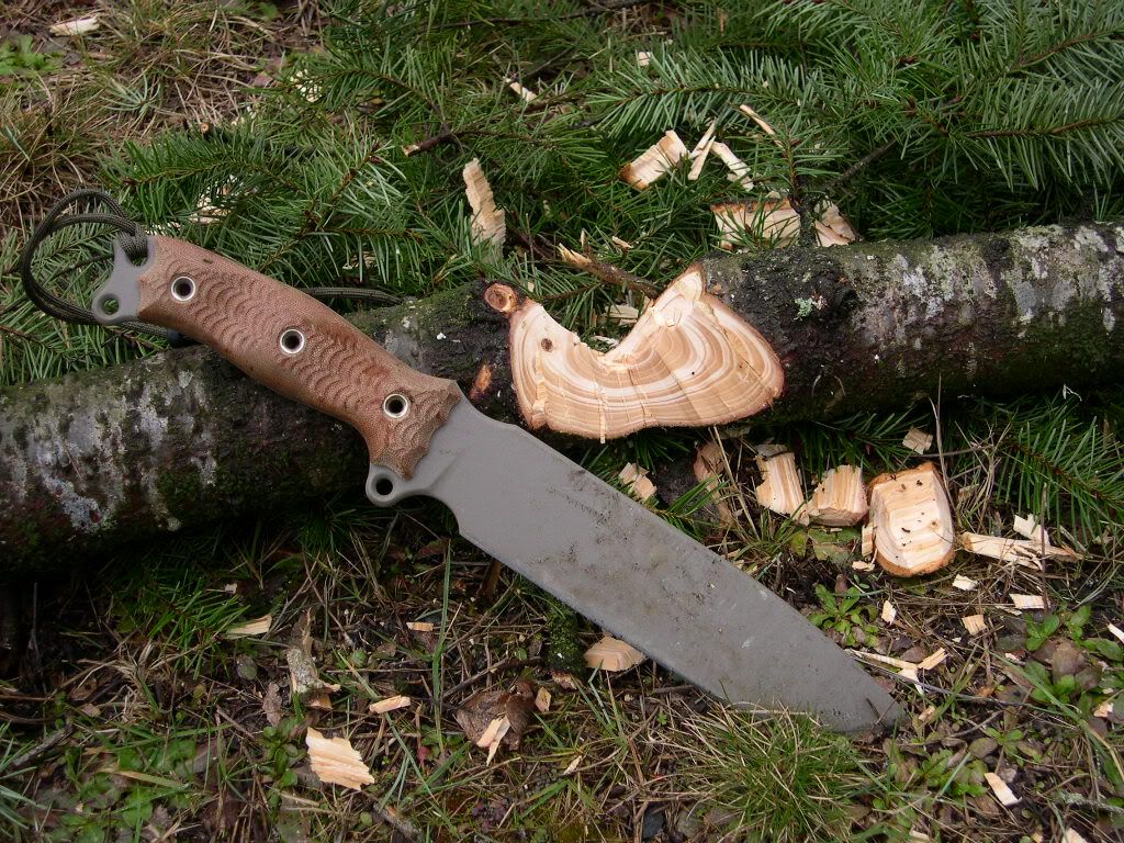 Anywhooo, this afternoon between spits and spats of drizzly rain I took the NMSFNO out to bust up some more of the windfall fir branches that threaten to overwhelm our yard. I was right in guessing that the sage-and-tan NMSFNO would be a righteous chopper. It worked mighty well for stripping off the small twigs zipper-style down the length of the branches, as well as segmenting up the branches themselves. The blade length, thickness, and spine-to-edge width provides a nice bit of mass and inertia while chopping. Nonetheless, I found that choking way back on the handle (pinky hanging off the end of the handle butt) provided better penetration with each stroke than holding the knife hammer-handed with my hand fully seated on the handle.