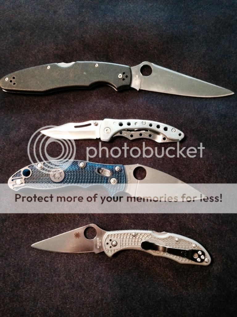 Rob wanted pics, sooooo: Missing are: Cold Steel Voyager 3.5 inches blade (at work) Kershaw folder with big rubber handle Spyderco Lady Bug
