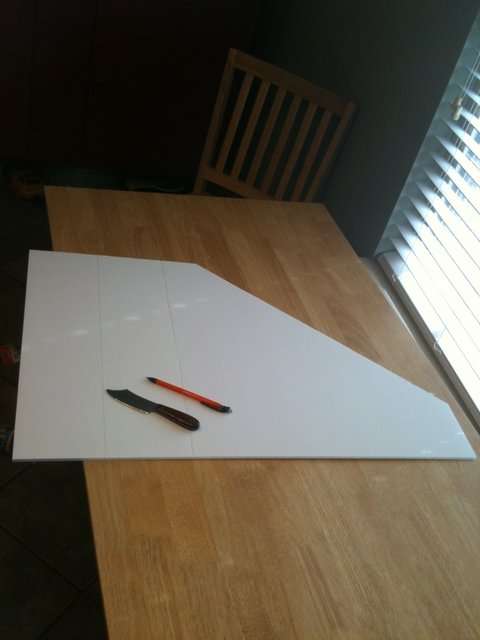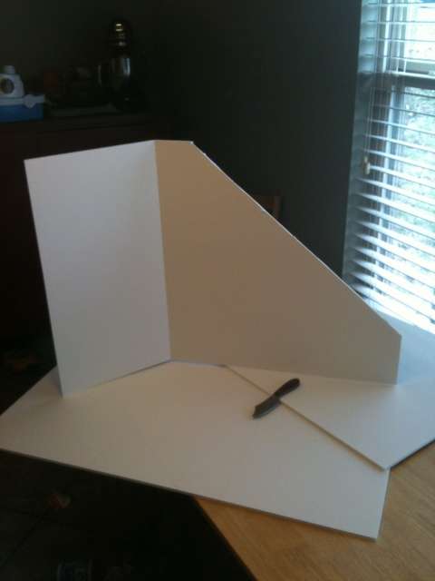 The first thing that I did was make the box part out of 3 sheets of foam board (aka poster board). I didn't have any measurements so I just laid it out using my phone as a length of measure so that both sides would be the same and I used the foam board as a straight edge.