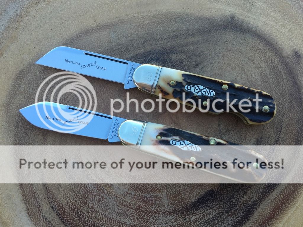 The pair below do have a name, "Lennie and George". George is the 1970 #62009½ red bone 2-blade 10-dot Barlow and Lennie is the 1973 #6143 daddy Barlow underneath.