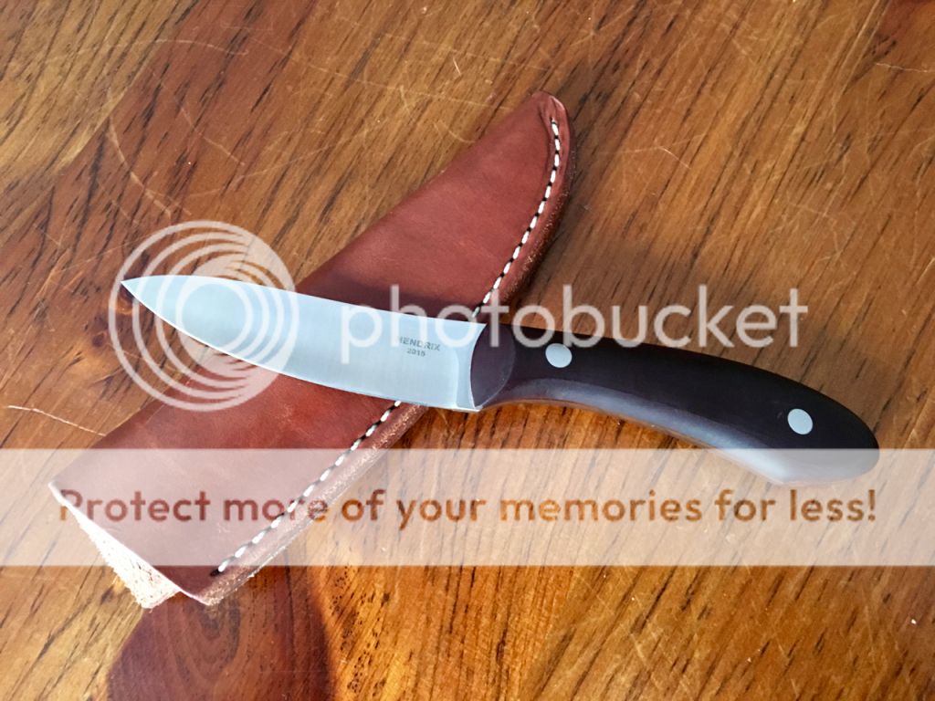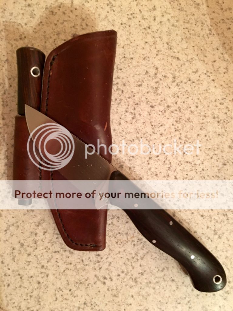 1. New Stinger w/5/32" thick A2, cutting edge is 2 3/4", overall length is 7 1/2", makassar ebony wood handle, fire steel w/makassar ebony wood handle & leather sheath w/fire steel loop $175