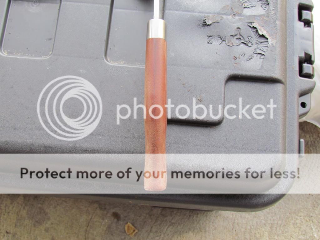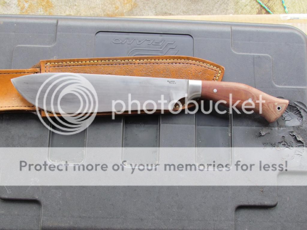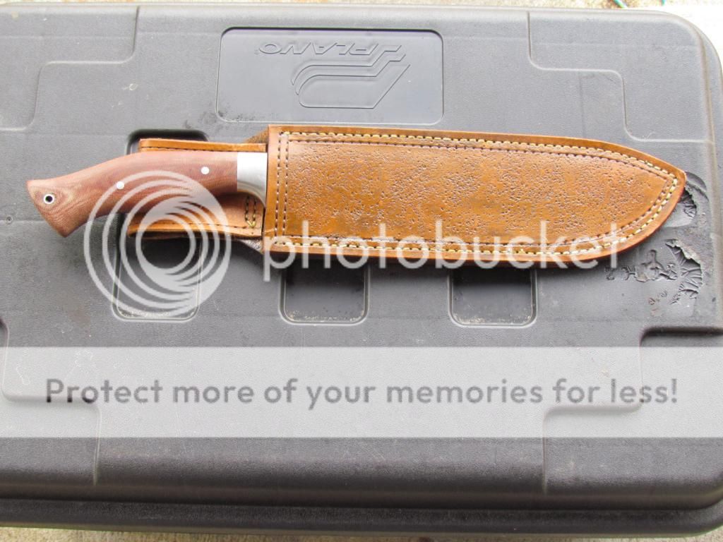 O1 chopper with micarta handle and 416 stainless guard. Overall length is 16"; blade is 10.00" tip to scales. Heat treated by me in a propane forge, triple tempered at 450 in a conventional oven. Blade is 3/16" O1 with convex grind and the spine has been drawn back. Handle is rabbeted tang natural micarta with 416 stainless guard, pins, and lanyard hole. Guard is sealed with JB weld and press fit. Sheath is 8-9 oz veg tan leather handmade by me. Price is $175 shipped CONUS. PAYPAL is rwnance1@windstream.net.