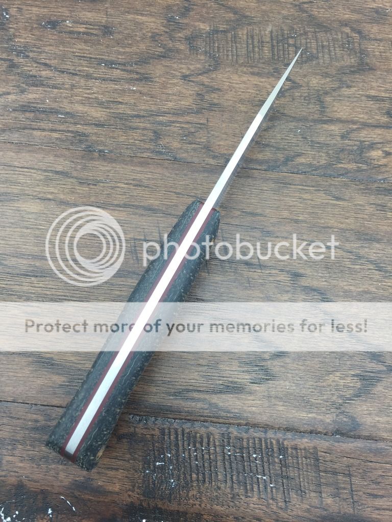Blade: 4" flat grind, distal taper, hand sanded to 400 grit, edge is 0.01" before sharpening