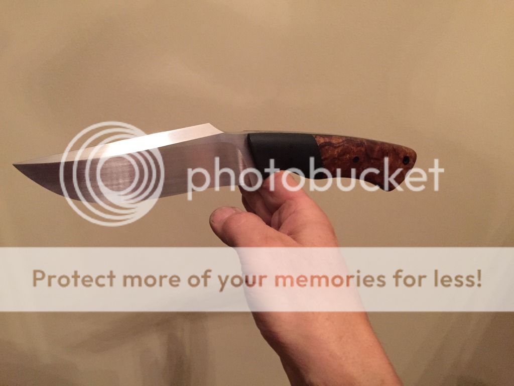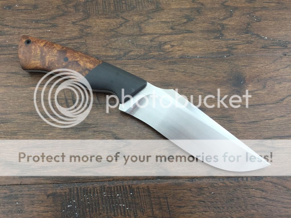 I've got a good sized hunter up for sale today. It's been on and off my bench for a while now as I've tried to incorporate a few buzzers and bells on it. It started life as a 1/4" bar of O-1 steel that I've hopefully pared down to something that would be at home on your hunting or camping trip.