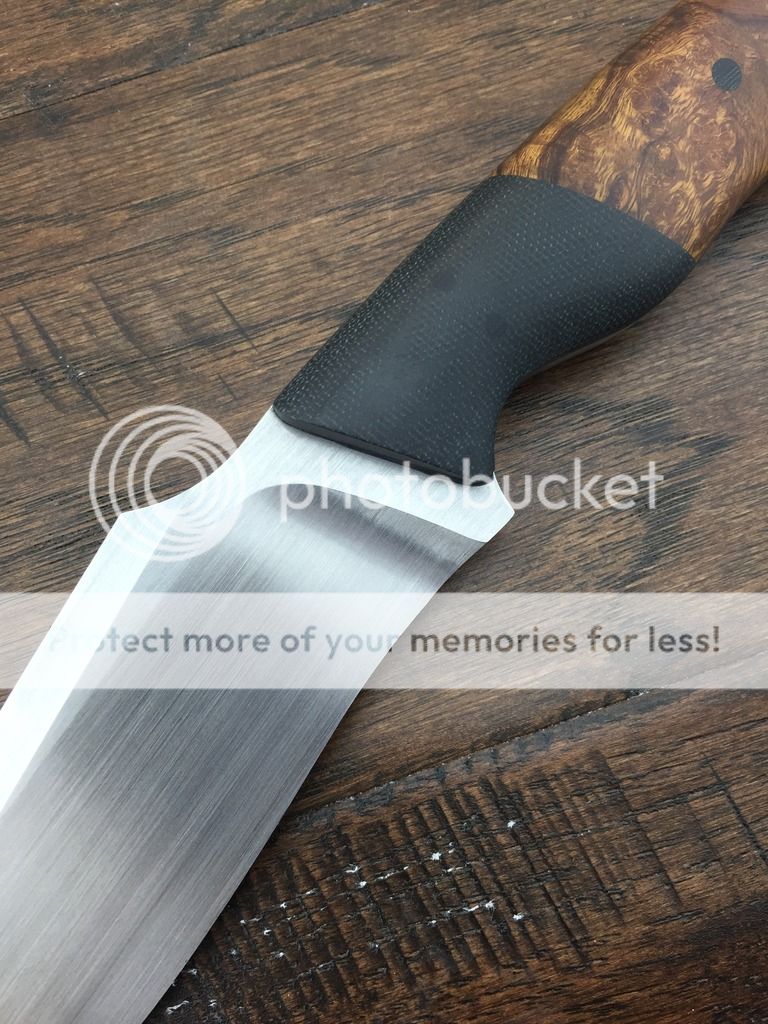 The blade is a recurve with a sweeping plunge and clipped thumb ramp. The tang is tapered and skeletonized so that the balance point is right at the finger guard. The handle is some of the nicest Arizona Desert Ironwood burl that I've ever worked with. The bolster is black canvas micarta. Right handed leather sheath included.