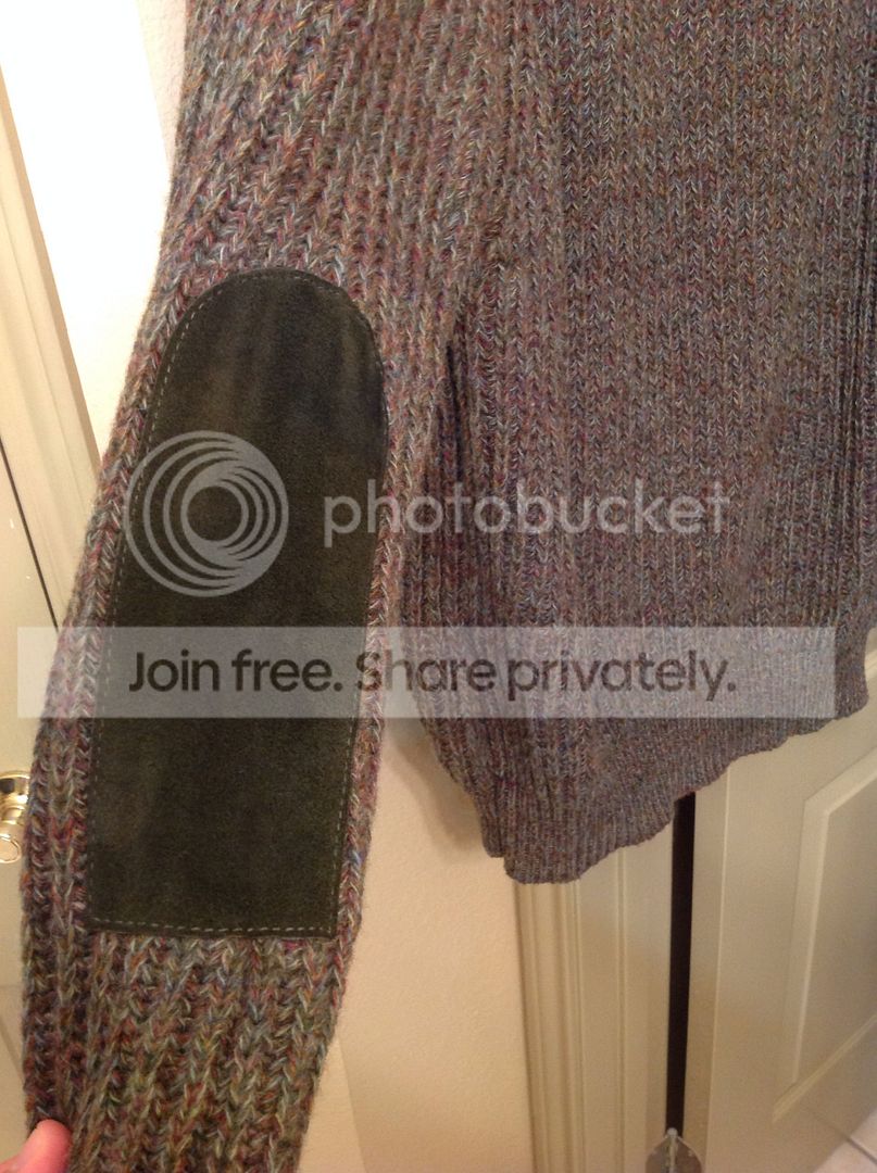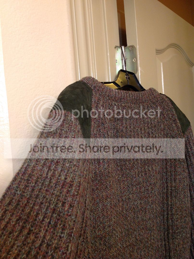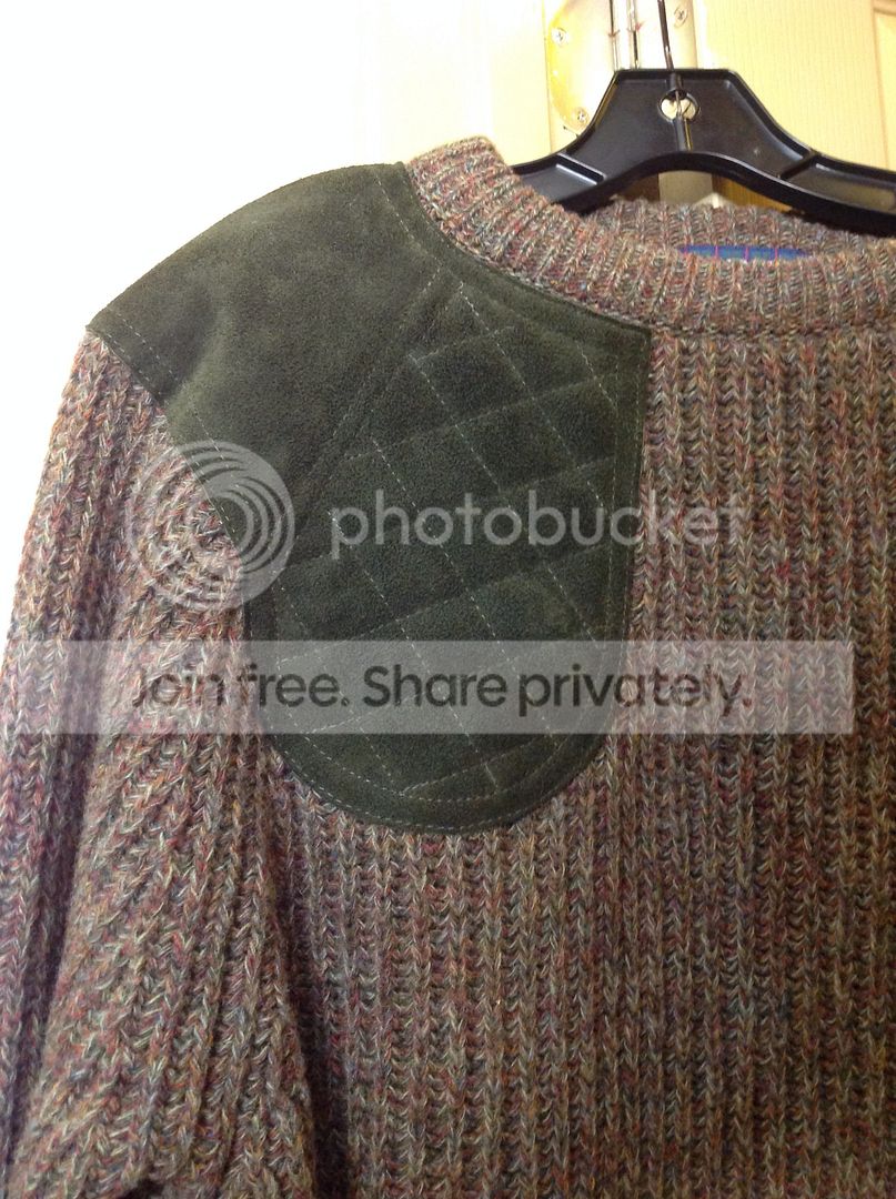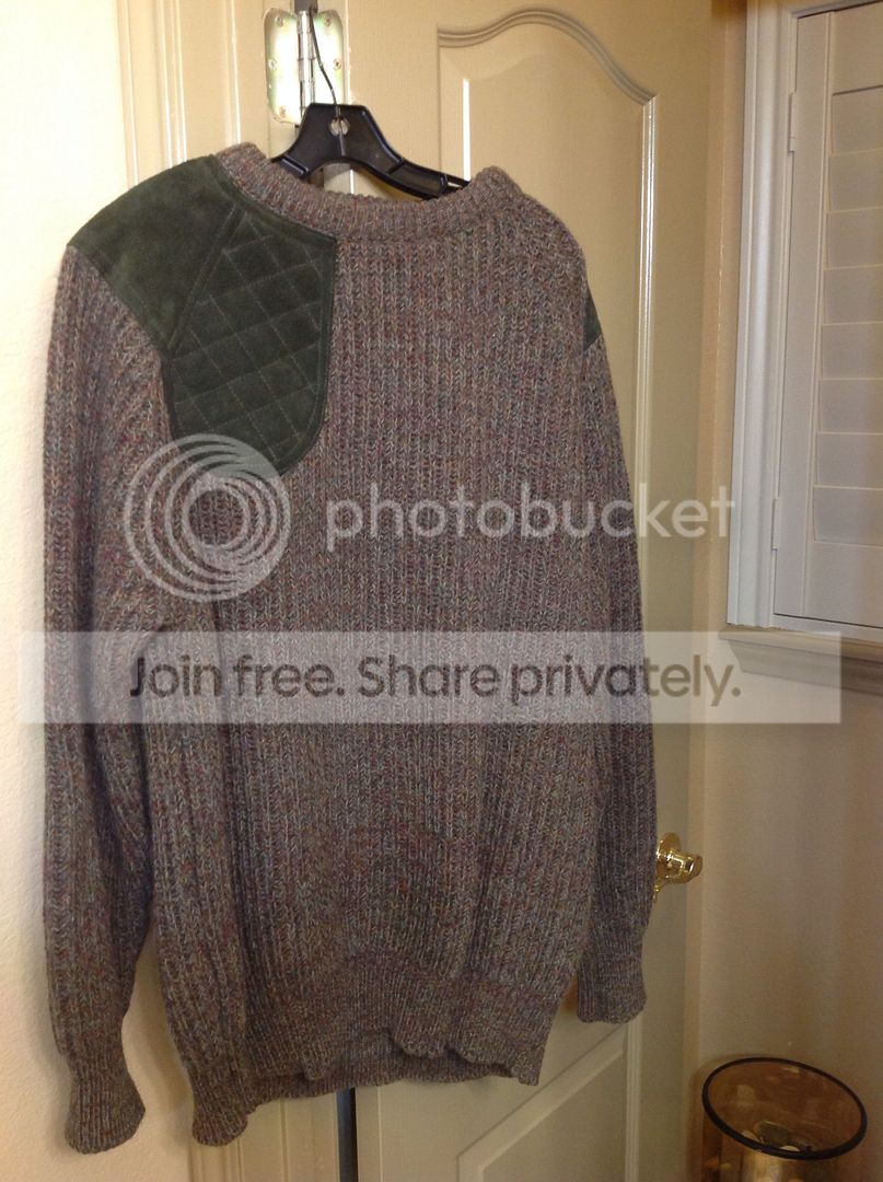 Brenire, new wool shooting sweater. Hand knit in the Scottish highlands. Forest green in color with rust hues. Sueded leather shoulder and elbow patches with a sueded leather recoil patch on the right shoulder. Never used, but has no tags (came this way). No size given but in my opinion inbetween an XL and an XXL. A fantastic sweater for hunting or bushcraft. 25" pit to pit and 31" down the back from the collar.